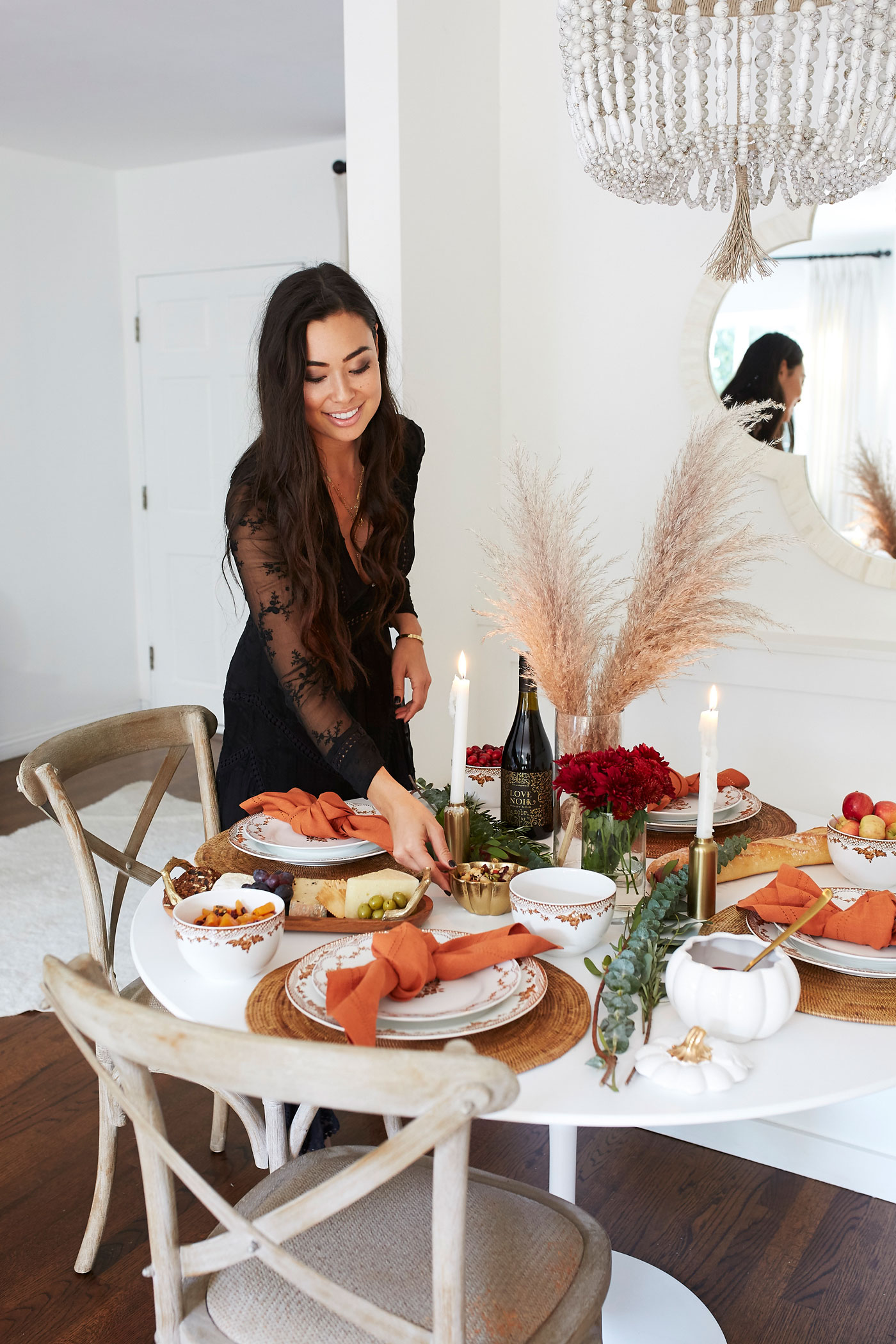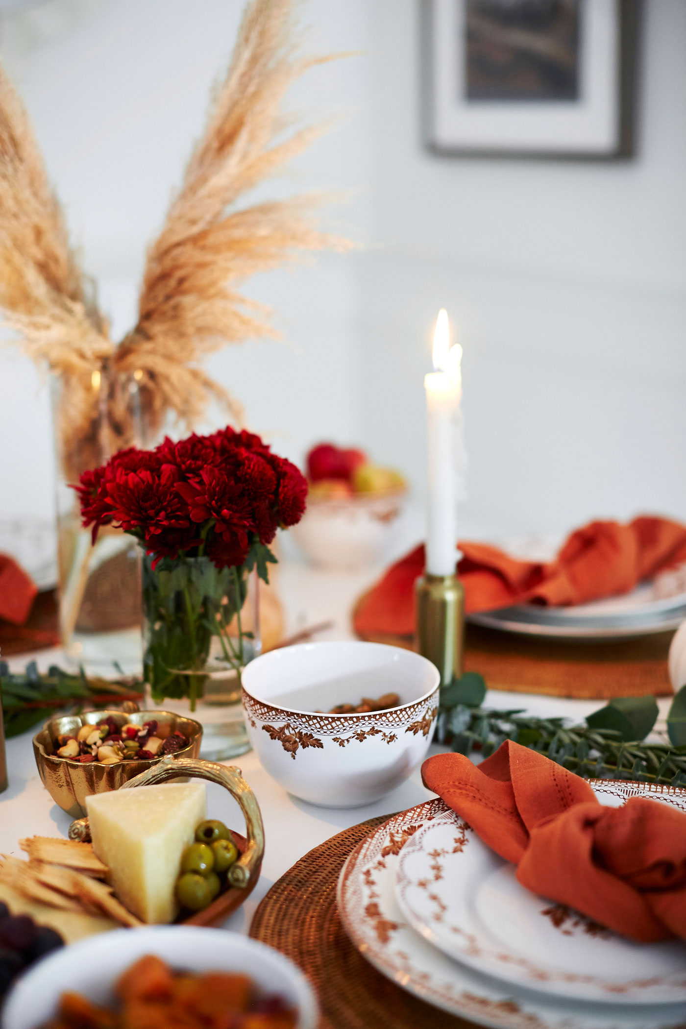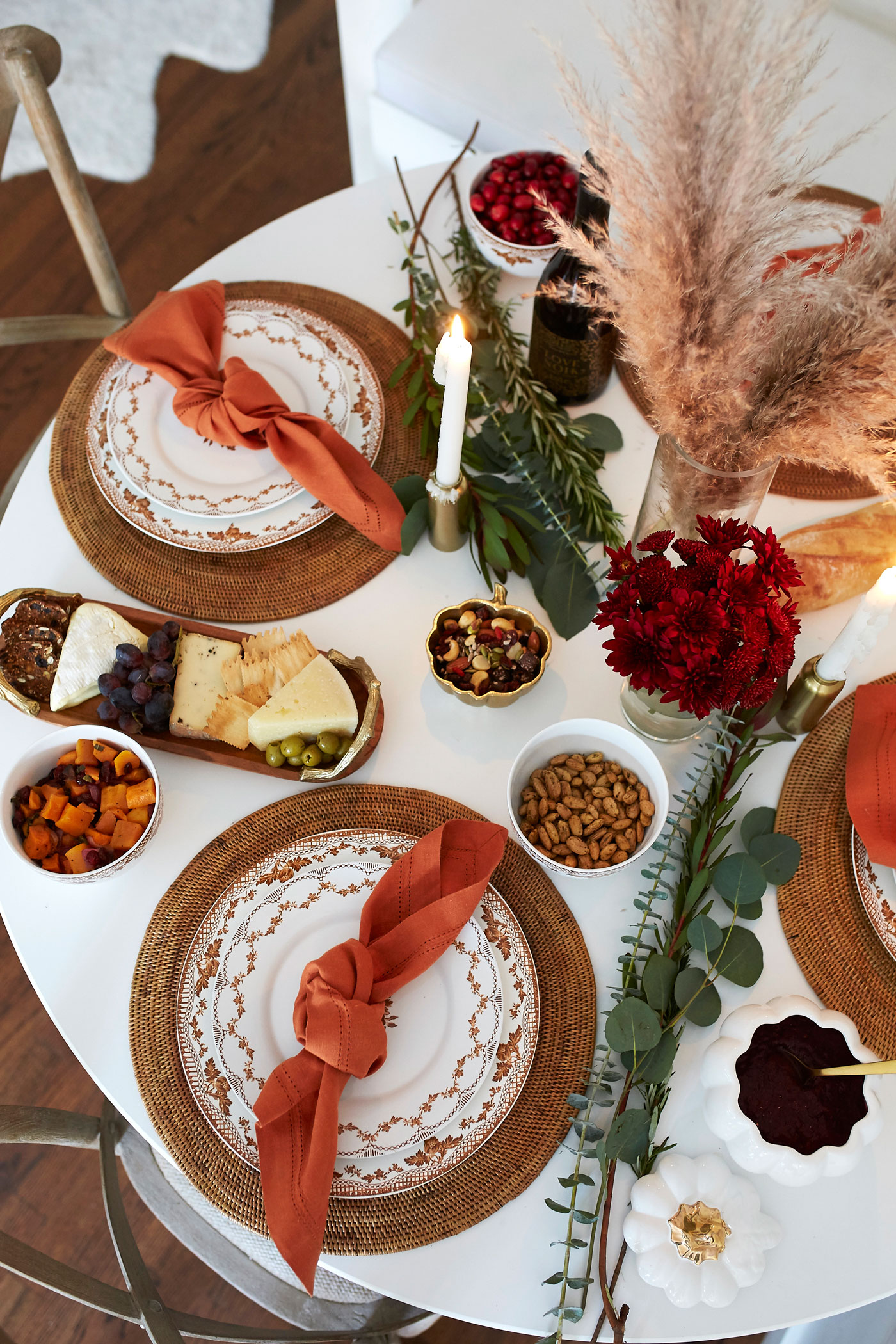 When it comes to decorating a table, I like to scan Pinterest and magazines before ordering things and heading to the store. This gives me a general idea of what vibe I’m going for so once I’m at the store I don’t feel overwhelmed or like a deer in the headlights! It’s always nice to be a little prepared since there are so many options. When I was at the market, I knew I wanted food and flowers that were aesthetically pleasing and went with my dishware colors. These fun pampas feathery looking plants stuck out at me, along with these deep red flowers. I bought some eucalyptus, rosemary, and other greenery to lay out since the table needed some foliage to make it more rustic. Shop everything for my Thanksgiving table decor below!