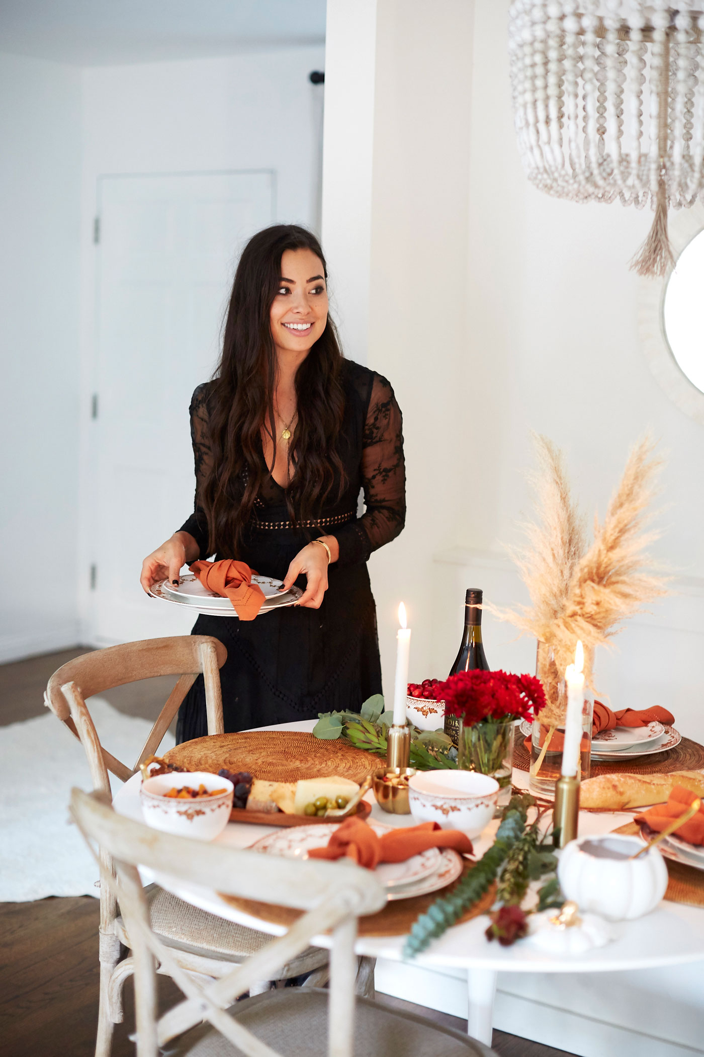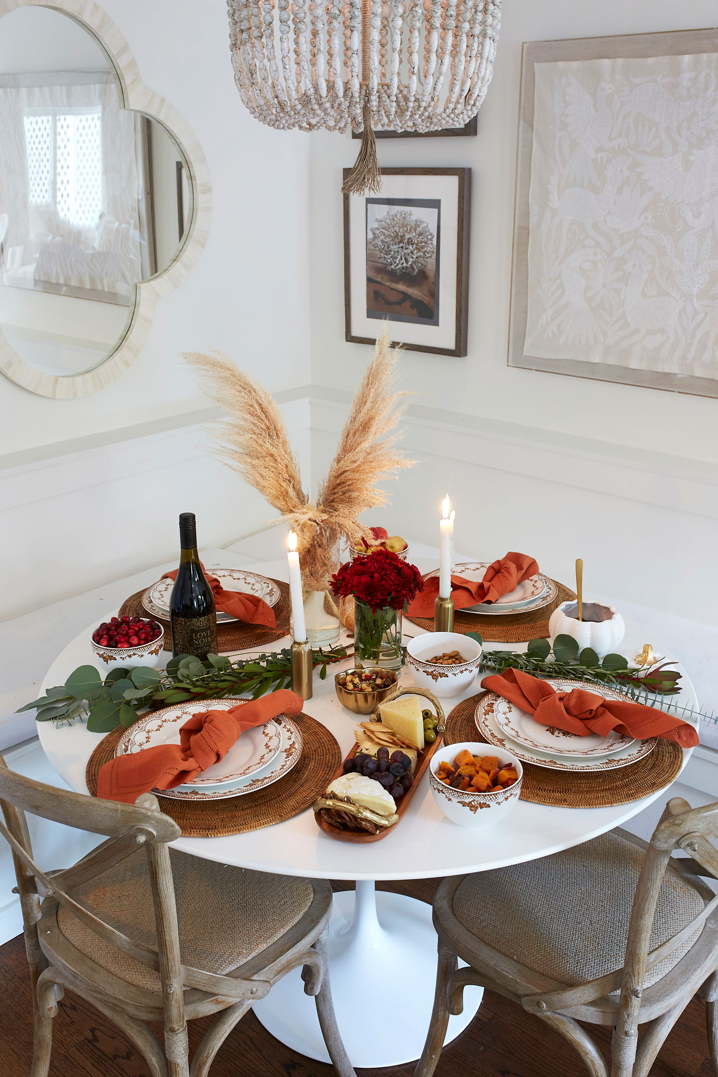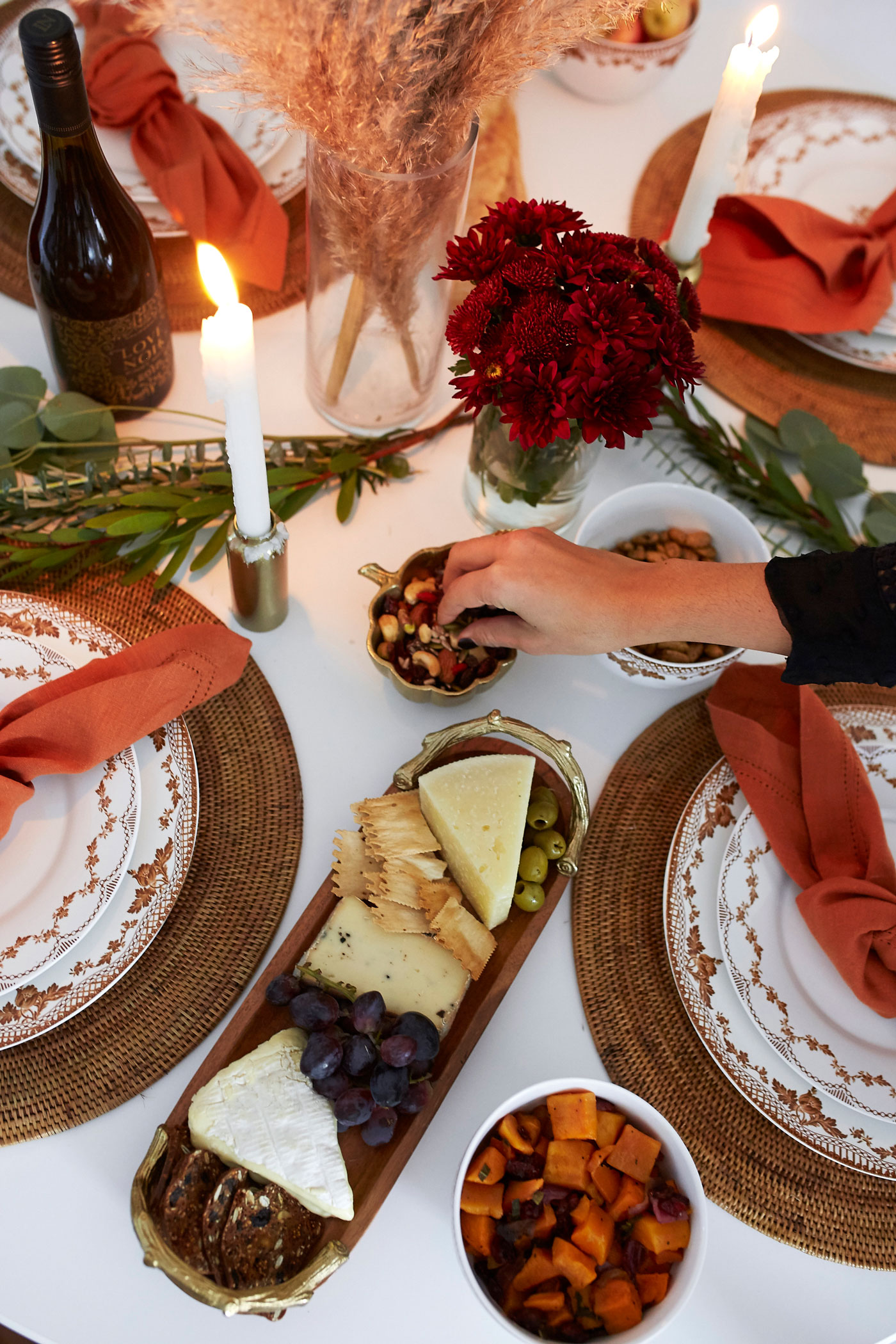 When it comes to decorating a table, I like to scan Pinterest and magazines before ordering things and heading to the store. This gives me a general idea of what vibe I’m going for so once I’m at the store I don’t feel overwhelmed or like a deer in the headlights! It’s always nice to be a little prepared since there are so many options. When I was at the market, I knew I wanted food and flowers that were aesthetically pleasing and went with my dishware colors. These fun pampas feathery looking plants stuck out at me, along with these deep red flowers. I bought some eucalyptus, rosemary, and other greenery to lay out since the table needed some foliage to make it more rustic. Shop everything for my Thanksgiving table decor below!