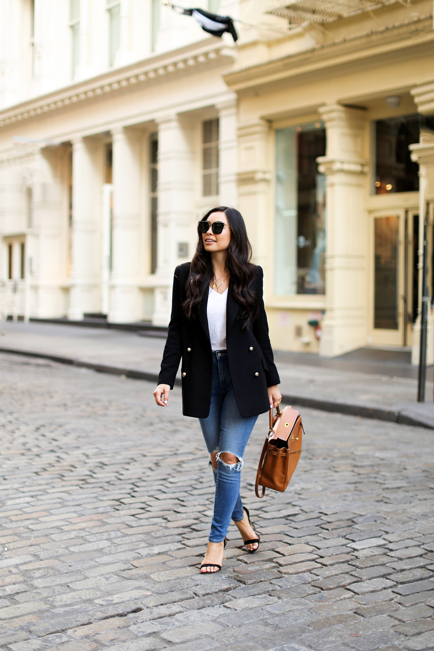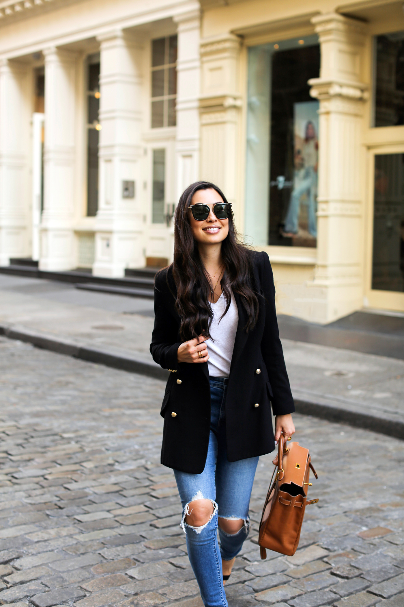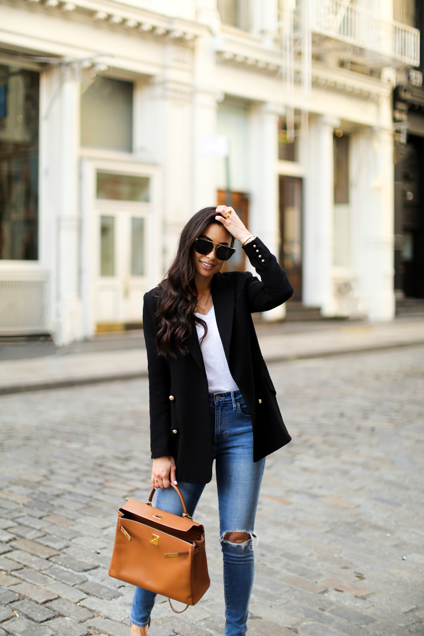 I love a black blazer with gold buttons because it adds just the right amount of glamour and sophistication to a classic piece. Pair it with a simple white V-neck and chunky gold jewelry. This black blazer, this one, and this one are all great quality. (I can attest to that because I’ve tried them all on!)