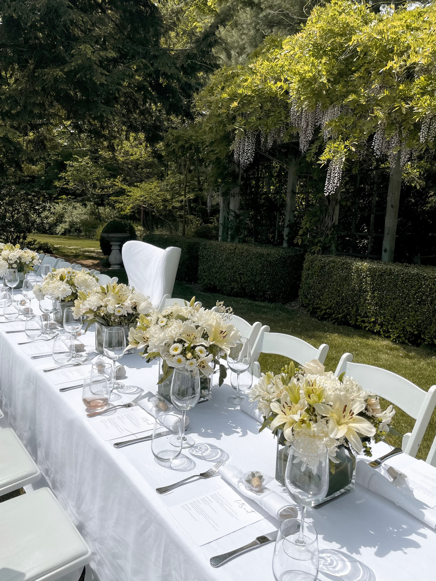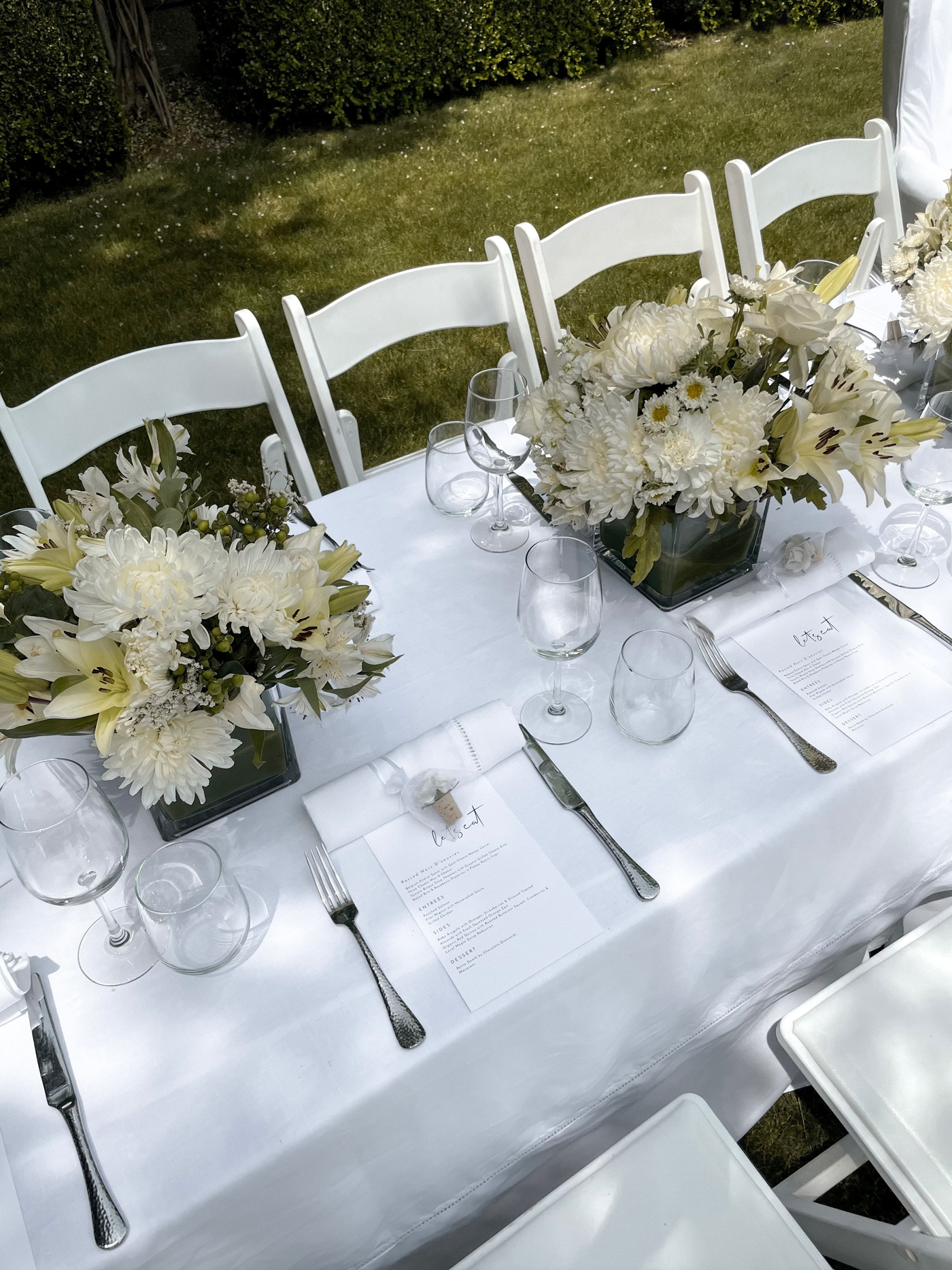 For the bridal table, they rented white tables and chairs from Durants Party Rentals in Fairfield County. They ordered these white linen tablecloths and napkins (another option) from Amazon (I honestly couldn’t believe they were Amazon since they looked exactly like my Williams Sonoma ones – such a steal!) My sister-in-law actually made the flower arrangements – I was so impressed. She used these simple clear vases. The food was catered by Garlelick and Herbs and the poached salmon (my fave!) was from Fjord. The menus were created through this Etsy shop. My sister ordered the cutest custom macarons from Stache of Goods for each guest to take home and Minuty generously provided the rosé. We played a short and sweet Couple Q+A game where everyone had to guess answers about us!