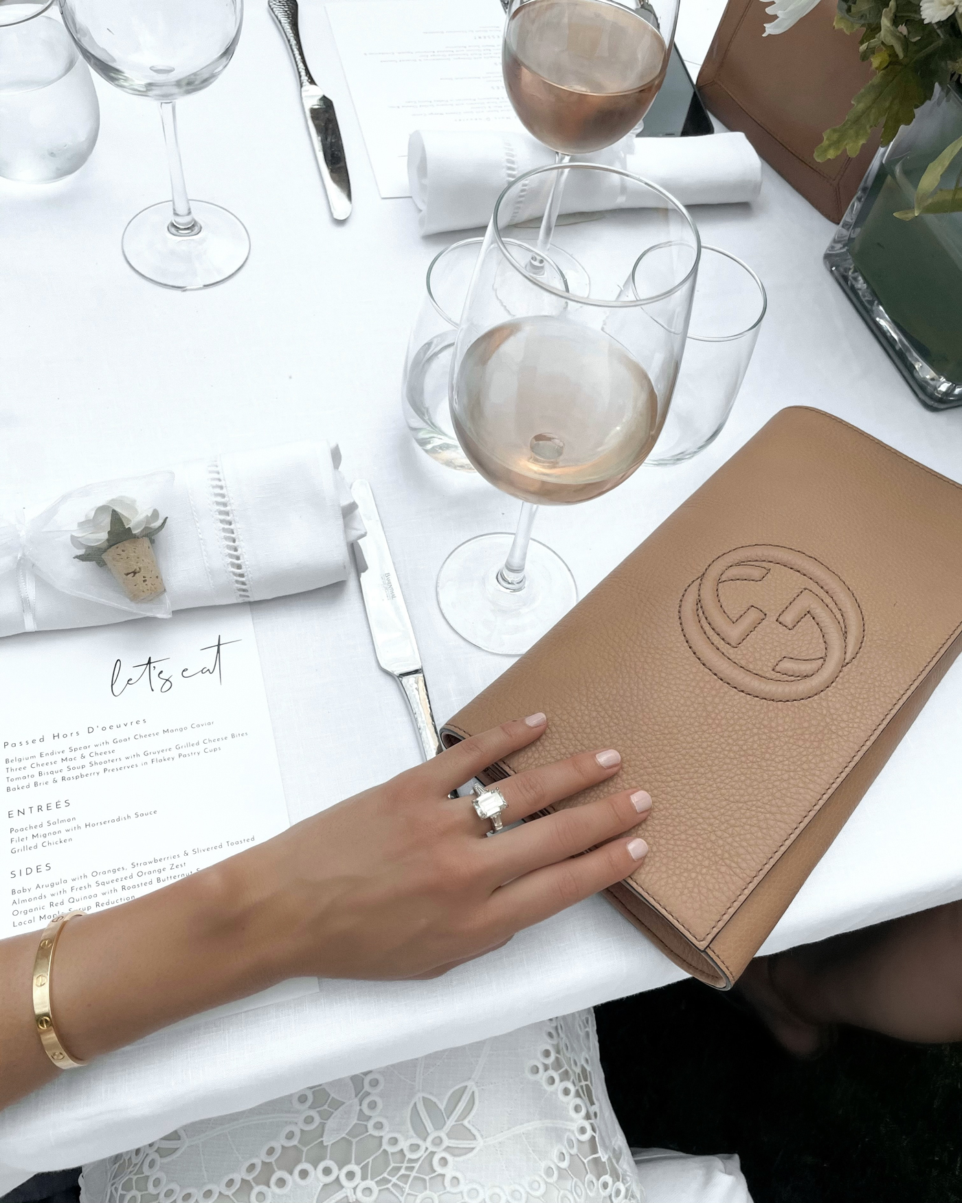 I wore this white eyelet Monique Lhullier dress with these Stuart Weitzman white leather heels. Surprisingly the heels were fine to wear in the grass – I didn’t sink in! The dress runs a bit small, so I recommend sizing up. This is another beautiful option, and I really love this one (under $140!) I linked a ton of additional bridal shower dresses on my Bridal Favorites page and LTK.