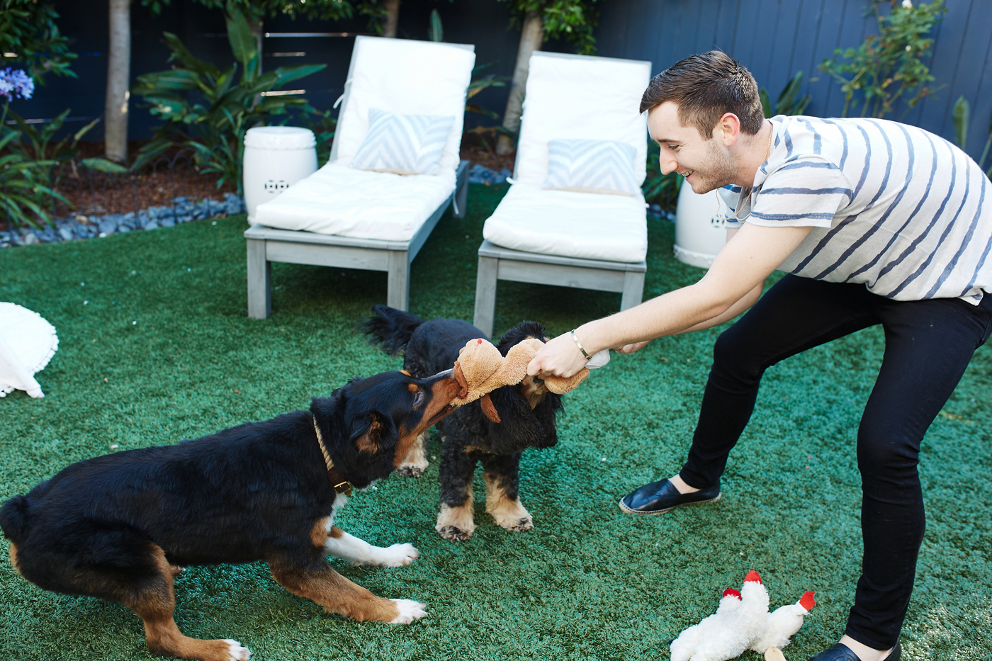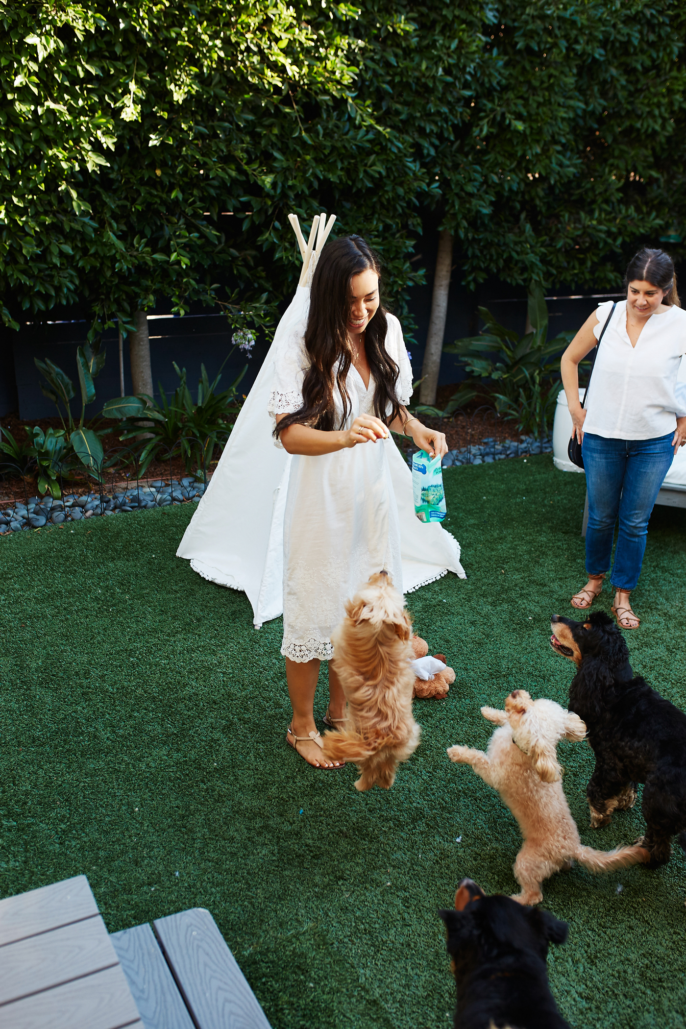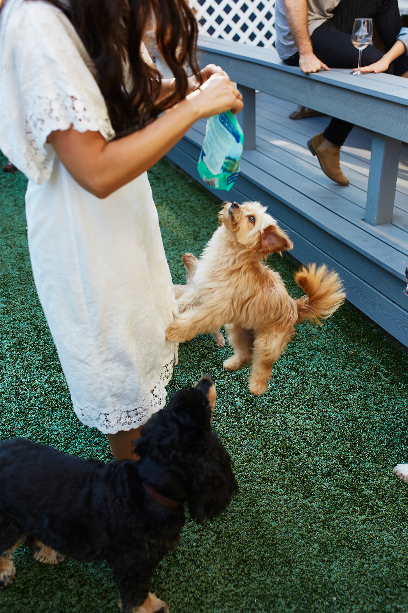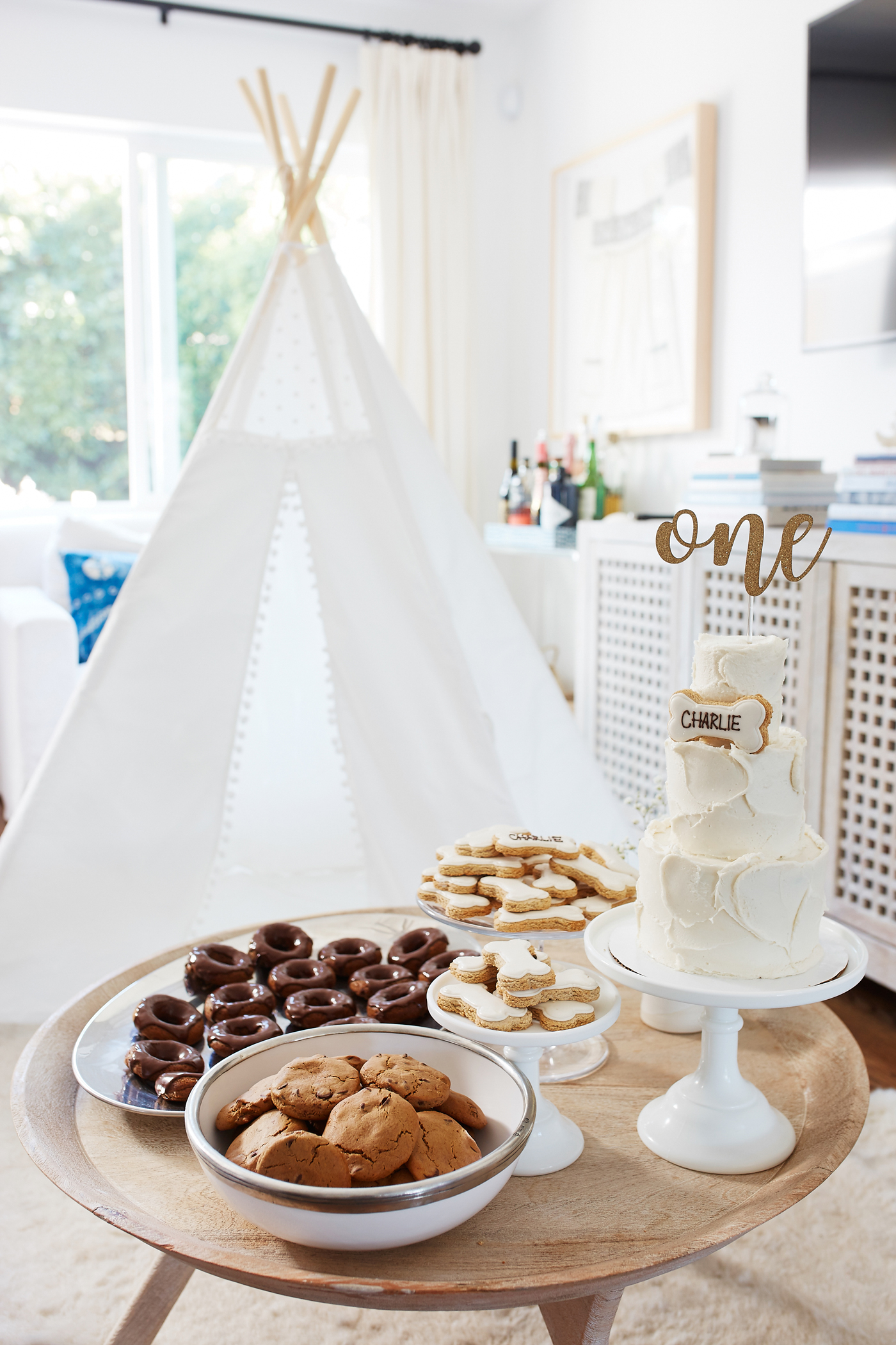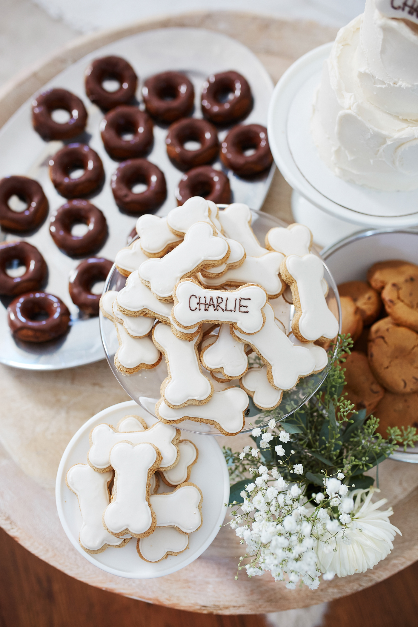 I had my friend Yvonne who bakes the yummiest vegan treats make custom dog bone shaped cookies, chocolate donuts, chocolate chip cookies, and a beautiful vanilla cake for the big day.  I put out a big cheese board with marcona almonds, tons of different cheese, grapes, and crackers.  Also, I ordered Mexican food from the most delicious place in Venice that makes homemade tortillas, had tons of drinks and mixers laid out, and put on a good playlist.  Everyone had a blast including the dogs who were running playing with all of the toys and eating every treat in sight haha!
