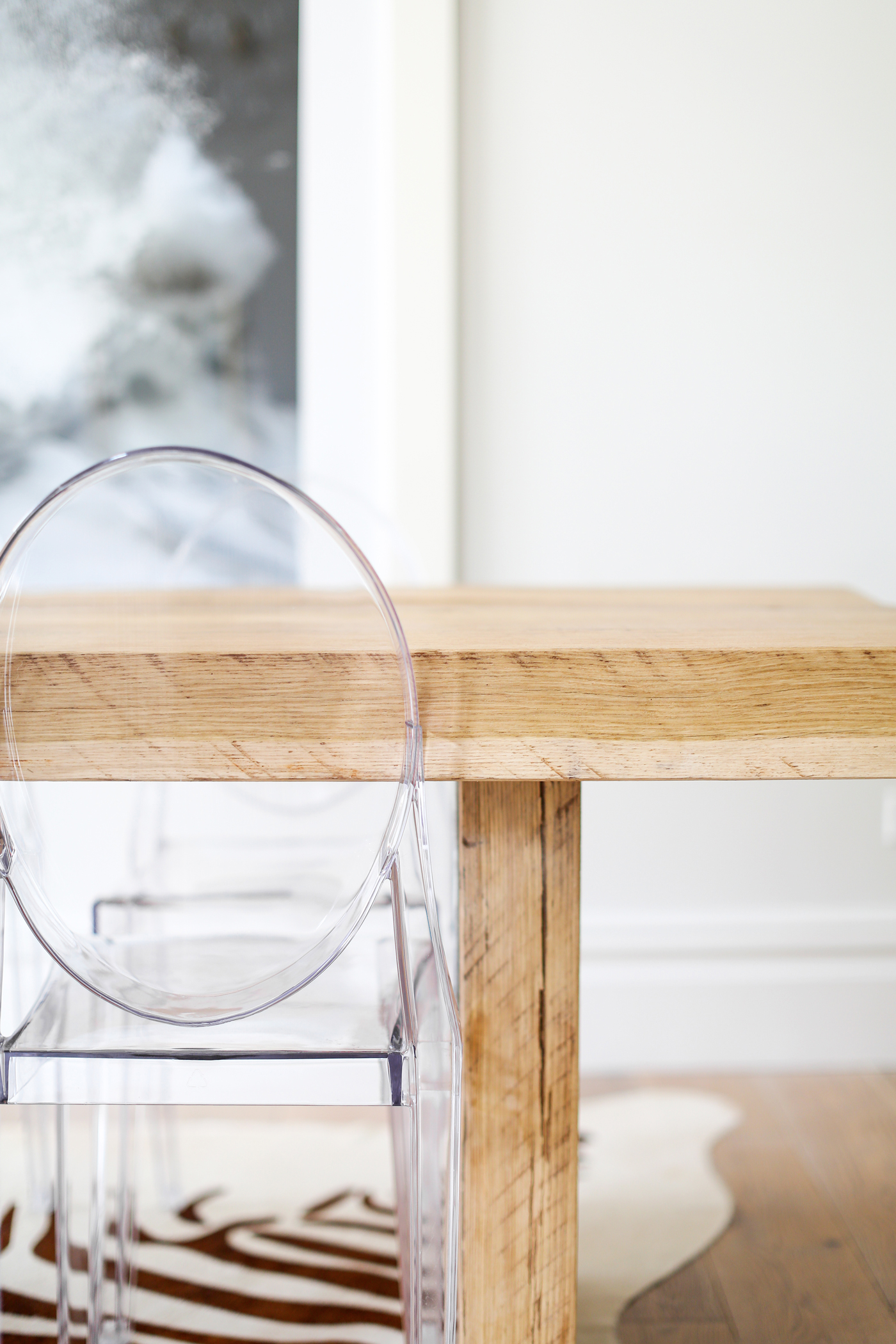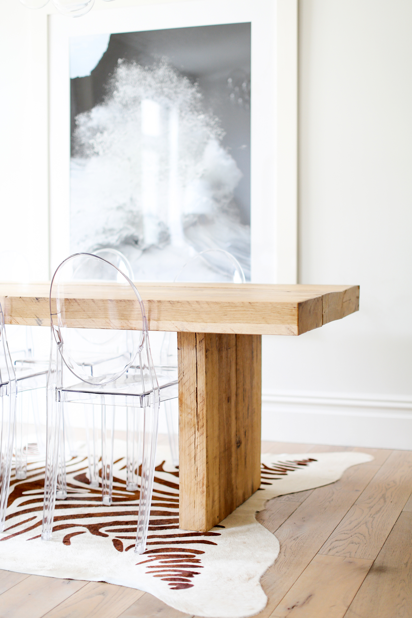 Buying this rug next year- would never think to pair the table with lucite chairs/ zebra rug but it all works so well!!
