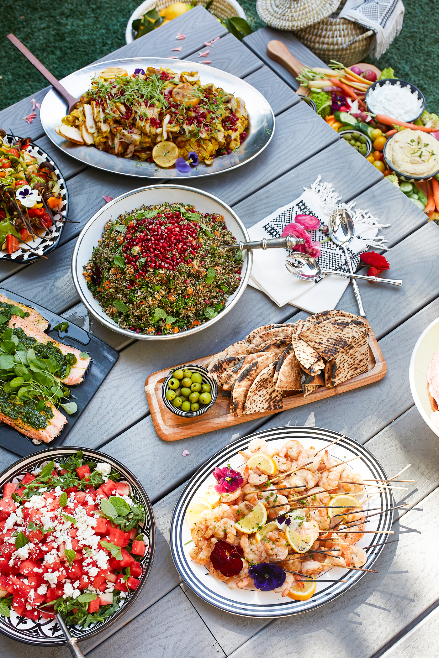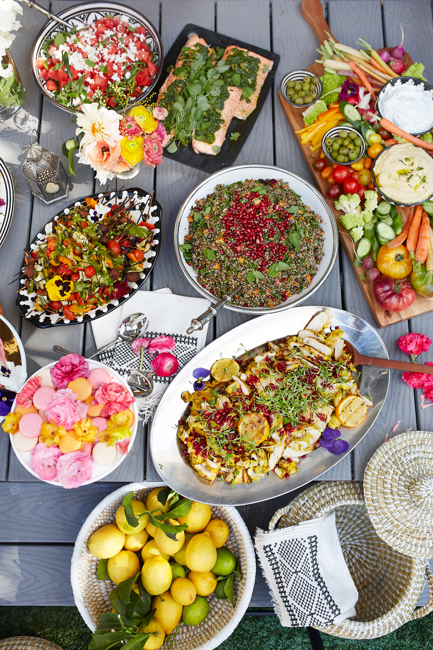Happy Friday! Here are the last few pictures from the engagement party! For this post, I wanted to focus on and talk about the FOOD! I hired my dear friend Alex Thomopoulos who is also the head chef at my favorite restaurant in Venice; Great White. Her food is classic comfort food with a gourmet twist – it’s healthy, fresh and colorful – and DELICIOUS DUH! I told her that I wanted the menu to be family/buffet style, California meets Moroccan dishes – with grilled chicken and vegetable skewers, a Tabbouli salad, cucumber feta watermelon salad, a gorgeous meat and cheese spread, tons of fresh crudite, hummus and tzatziki. She went above and beyond and to this day – friends and family are still talking about the food. The salmon was one of my favorite dishes along with the gluten free citrus cornbread cake! Enjoy your weekend!