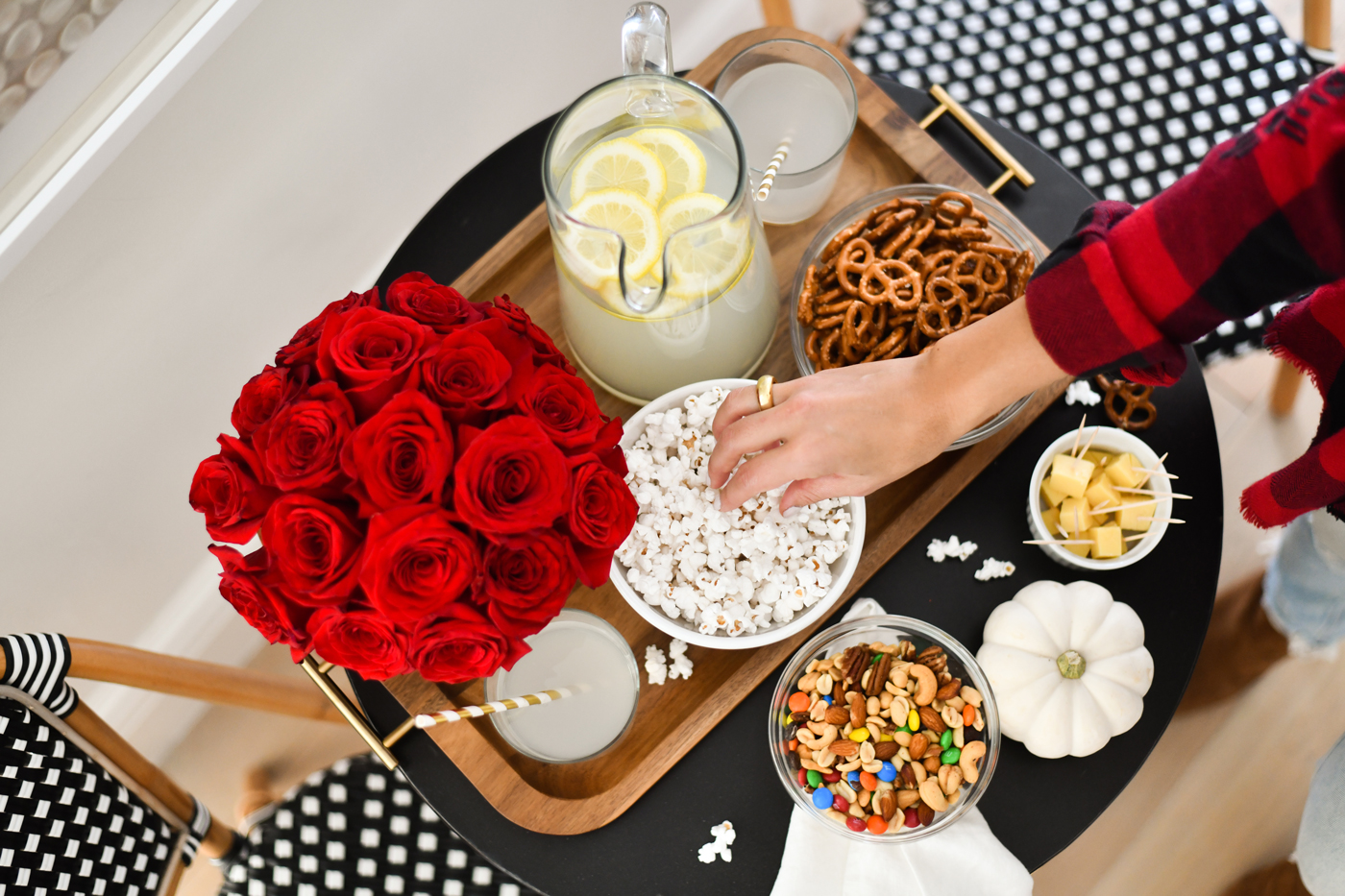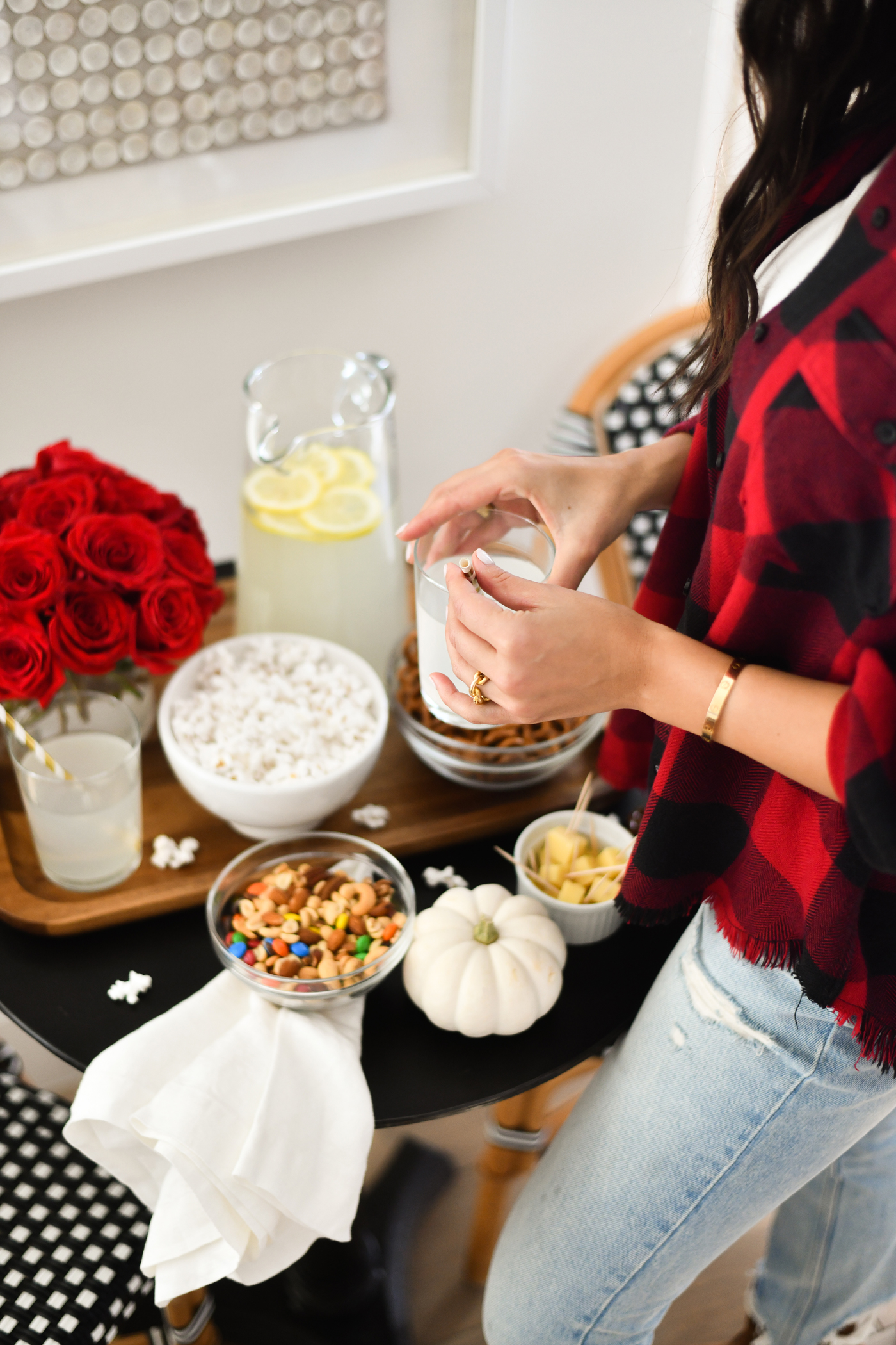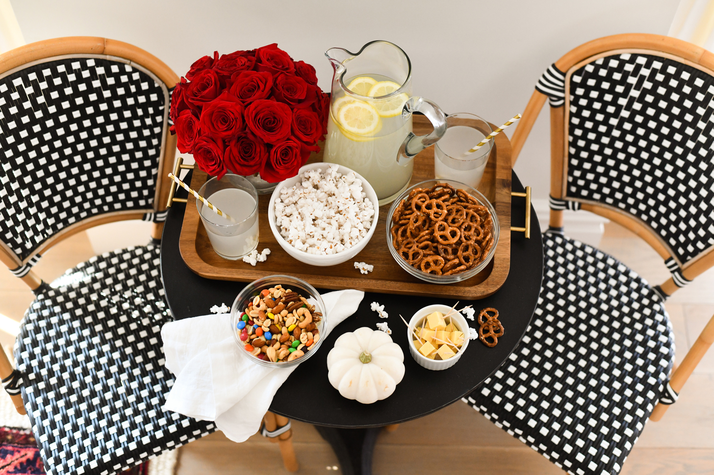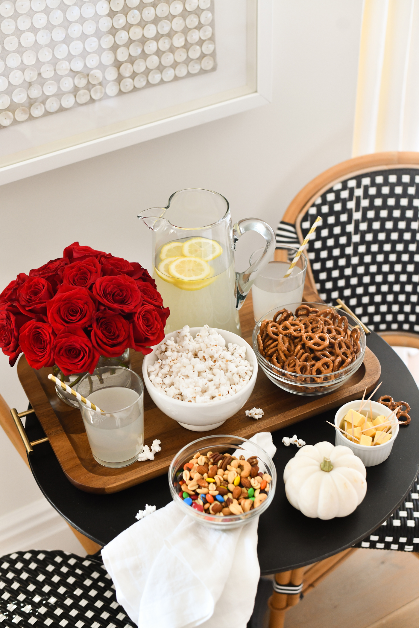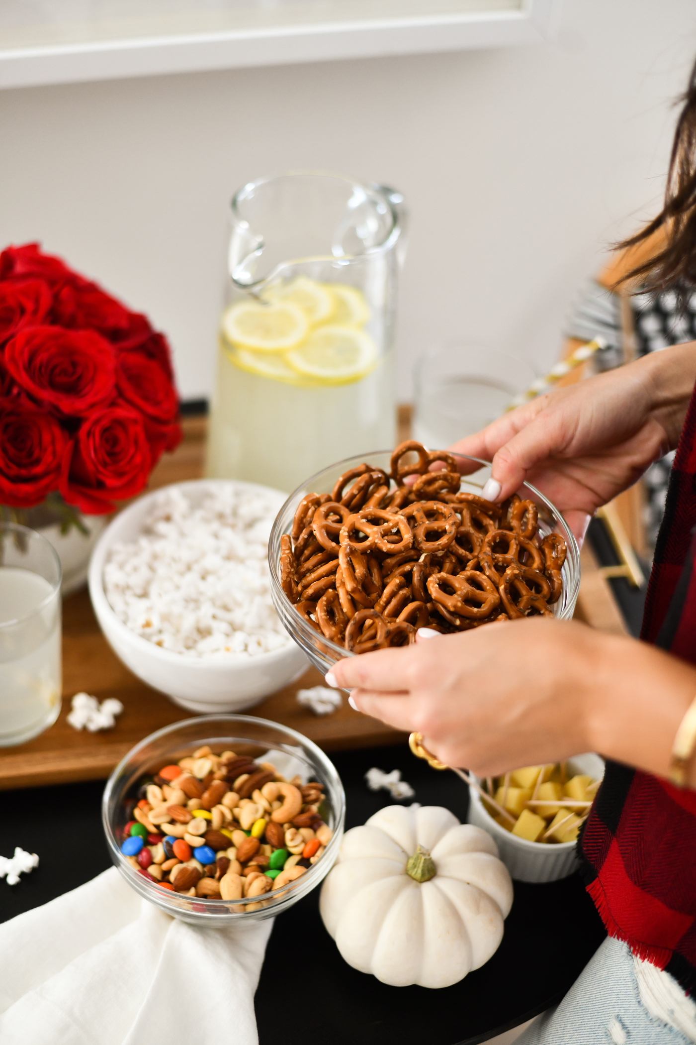 First things first, let’s talk about the food! My personal fave part of entertaining is getting to snack on all of the yummy treats! You can’t throw a game day party without something salty and something sweet to nosh on. I picked up all of the essential snacks like; chips, salsa, pretzels, popcorn, M&Ms (peanut butter are the bestttt right?!), cheese cubes, and mixed nuts.