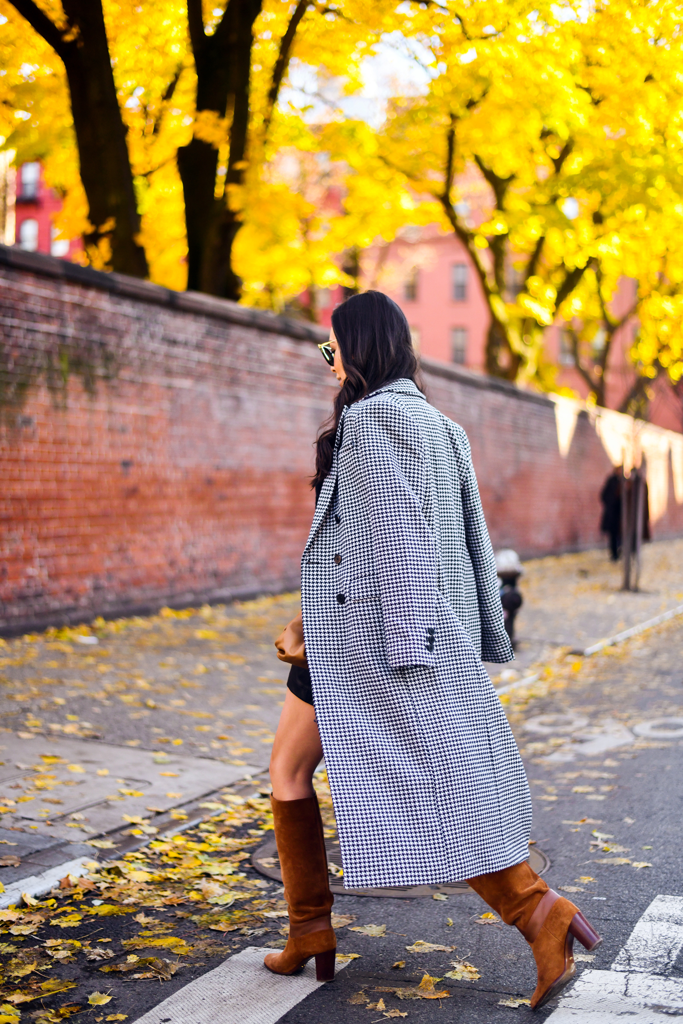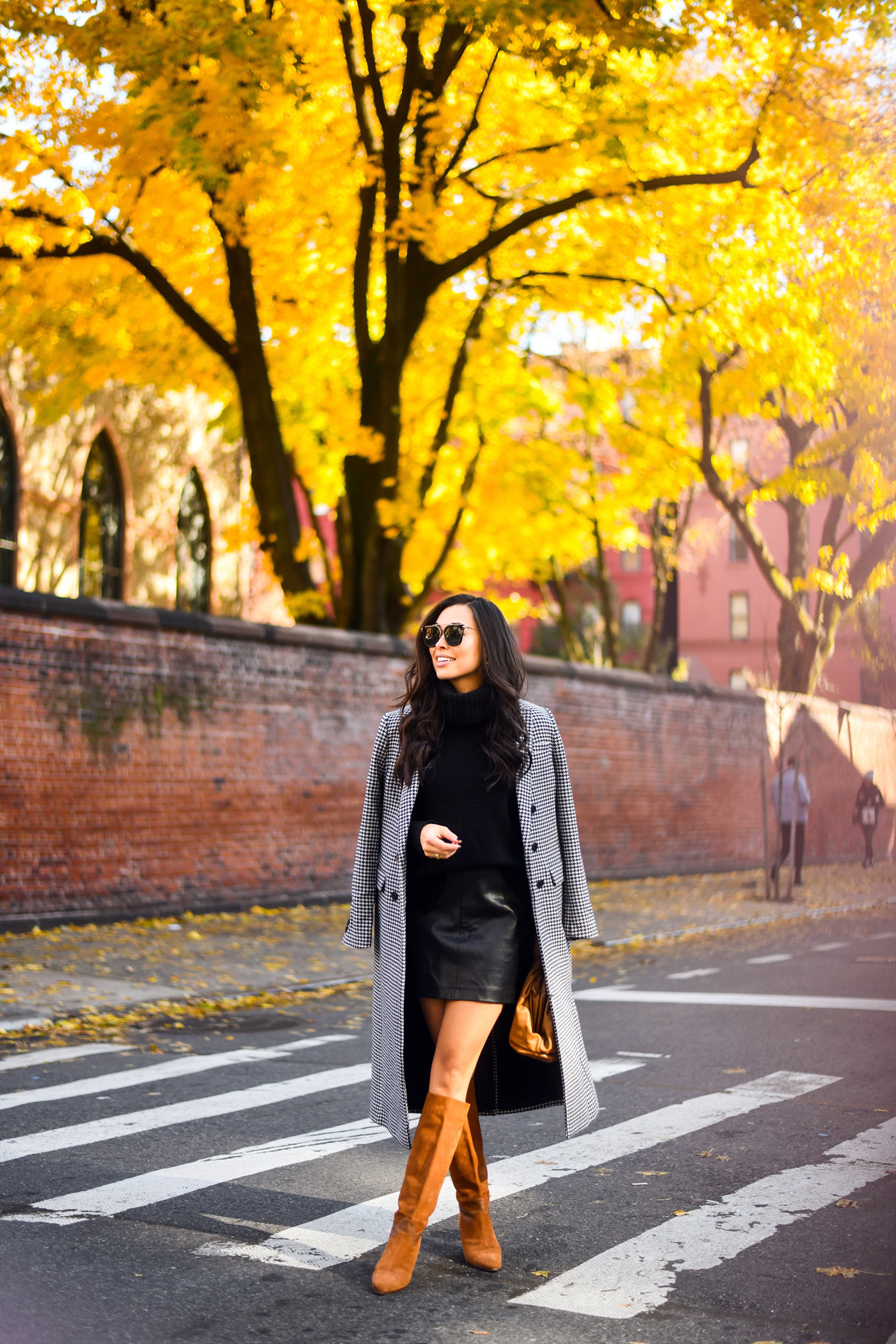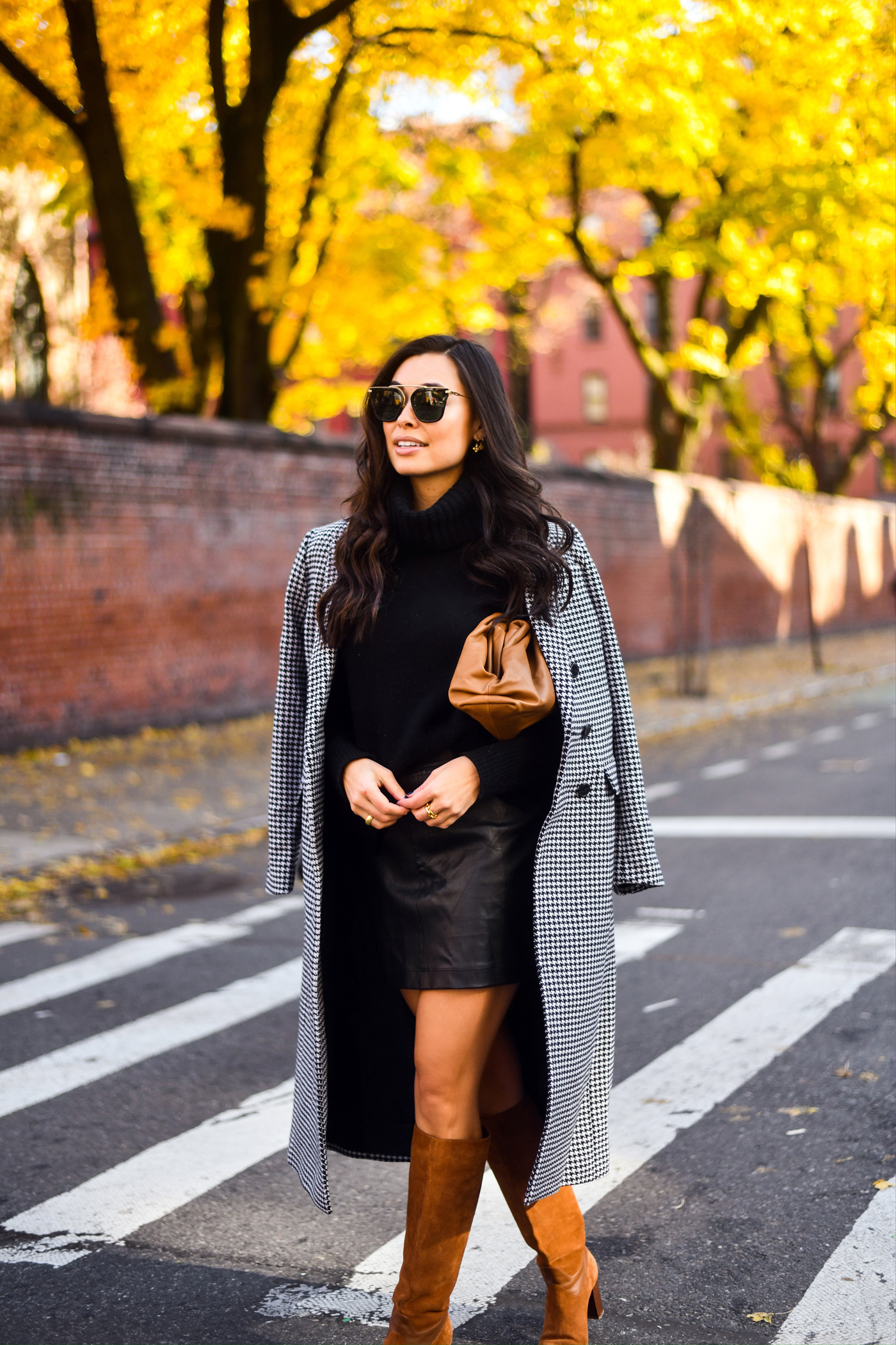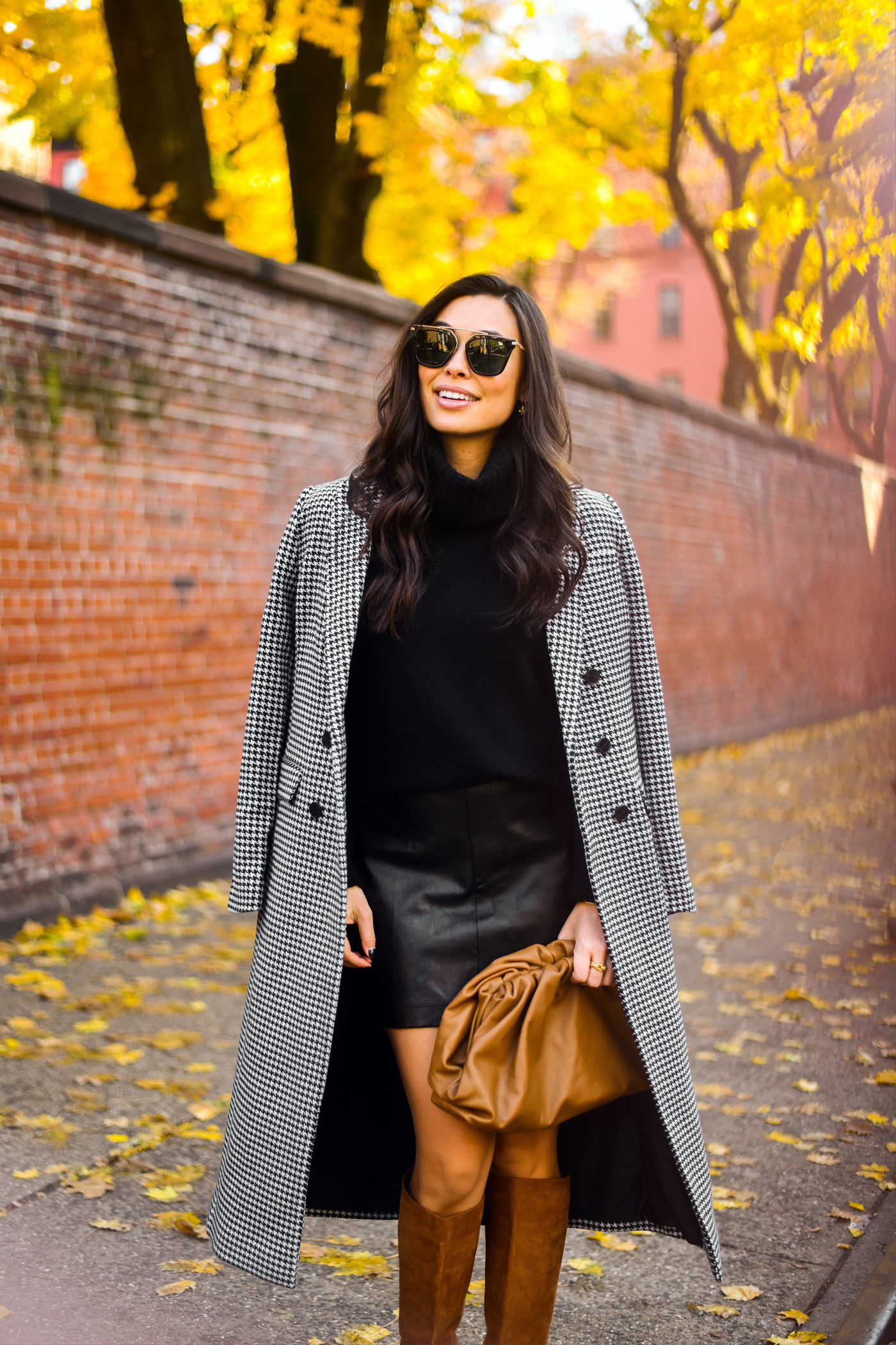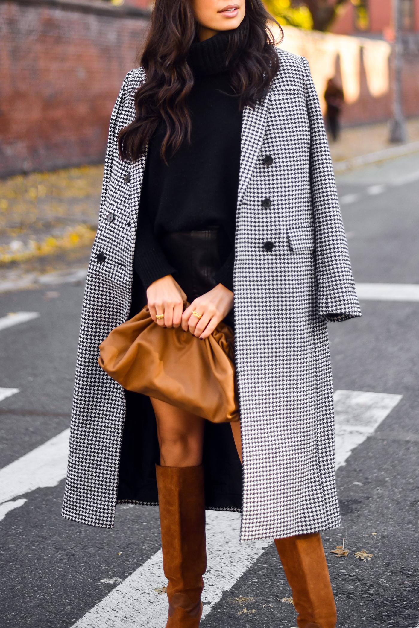 These photos are from last fall in NYC, but I never got around to sharing the full outfit details! This coat is beyond timeless – you can’t go wrong with houndstooth for fall. I mixed the houndstooth print with all black and brown pieces. I loveeee the combo of black + brown together – it’s often an overlooked combination!