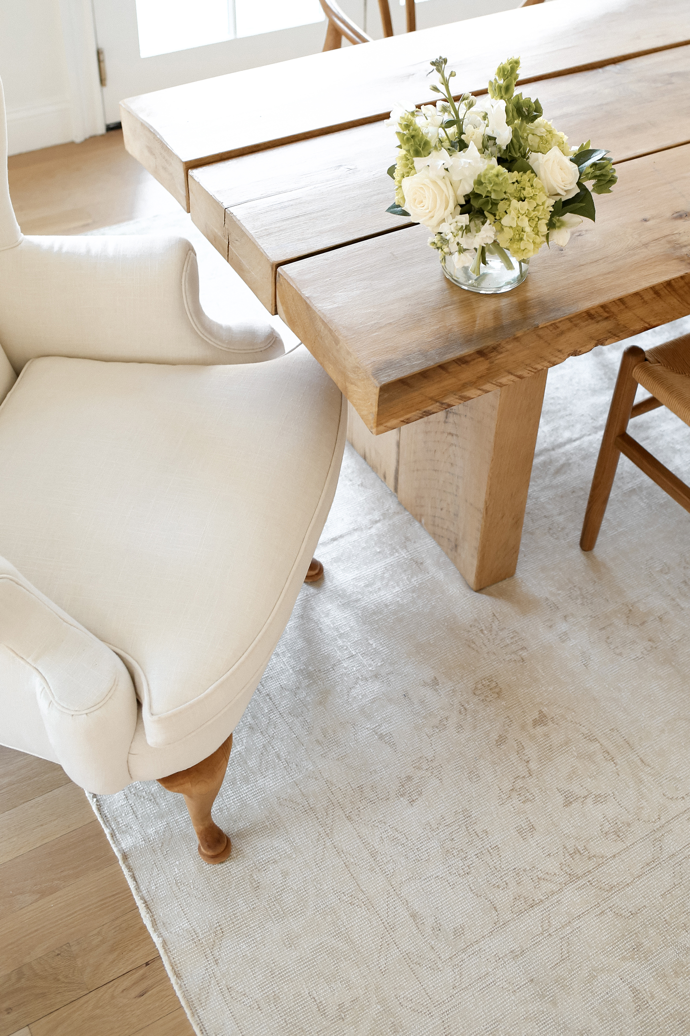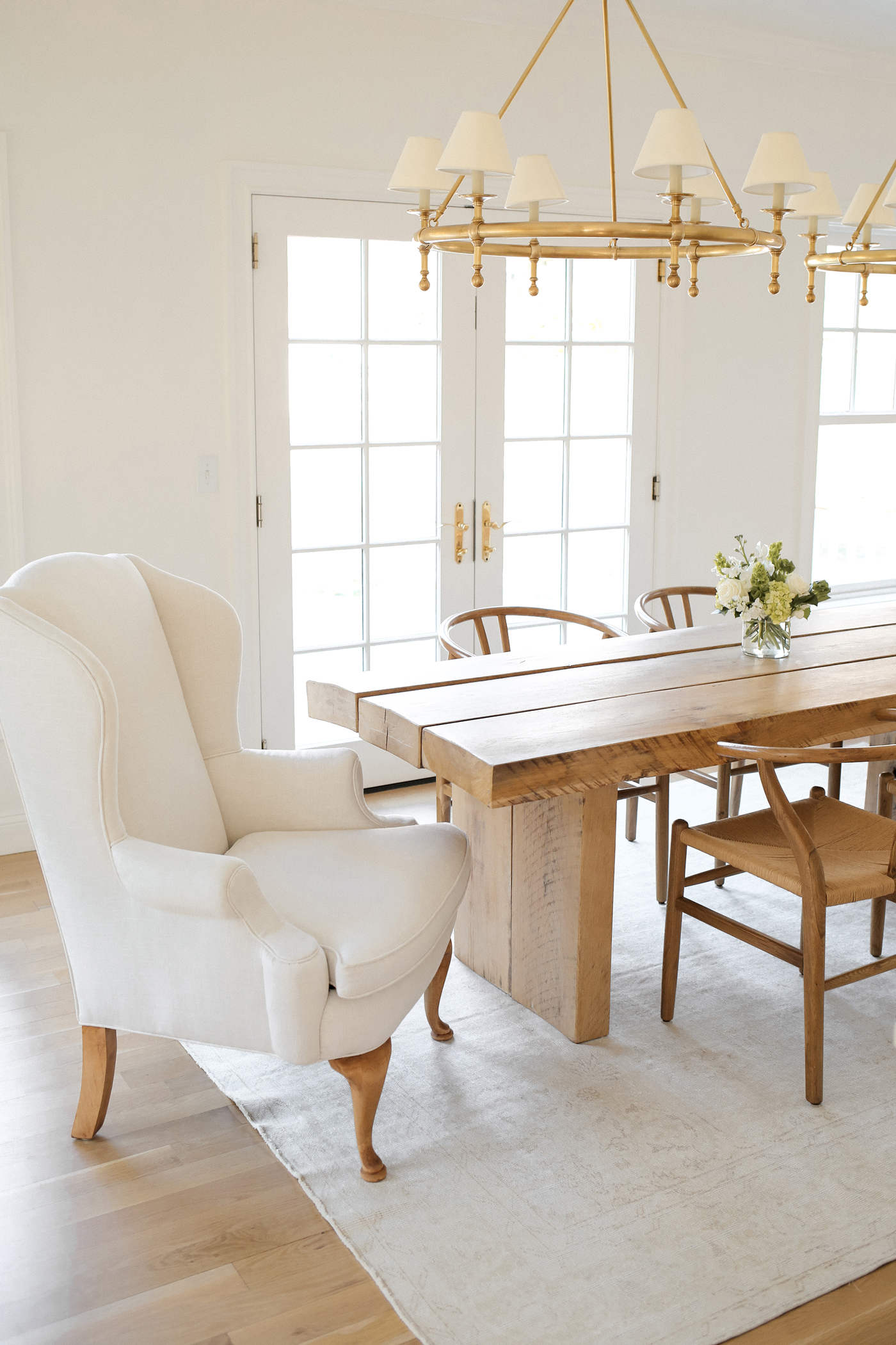 Our Connecticut dining room has finally come together in the most beautiful way! Many of you may remember we scored these wingback chairs at an estate sale for $7! They were hideous before – covered in a bright green fabric, and we had them reupholstered in this cream linen material. Thomas then sanded down the legs of the chairs and stained them a light honey color. I am so happy with the end result. It really is incredible what a little stain and fabric can do to a chair.