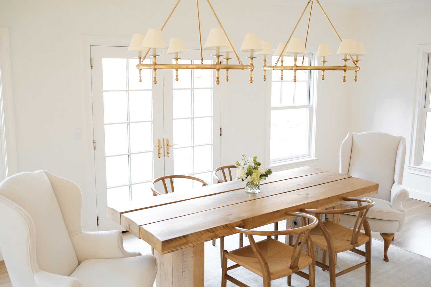 Our Connecticut dining room has finally come together in the most beautiful way! Many of you may remember we scored these wingback chairs at an estate sale for $7! They were hideous before – covered in a bright green fabric, and we had them reupholstered in this cream linen material. Thomas then sanded down the legs of the chairs and stained them a light honey color. I am so happy with the end result. It really is incredible what a little stain and fabric can do to a chair.