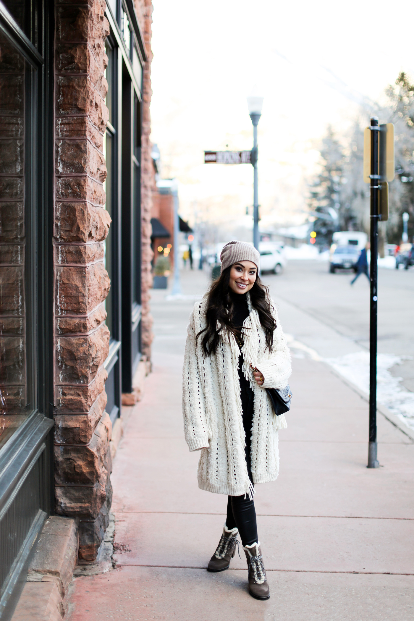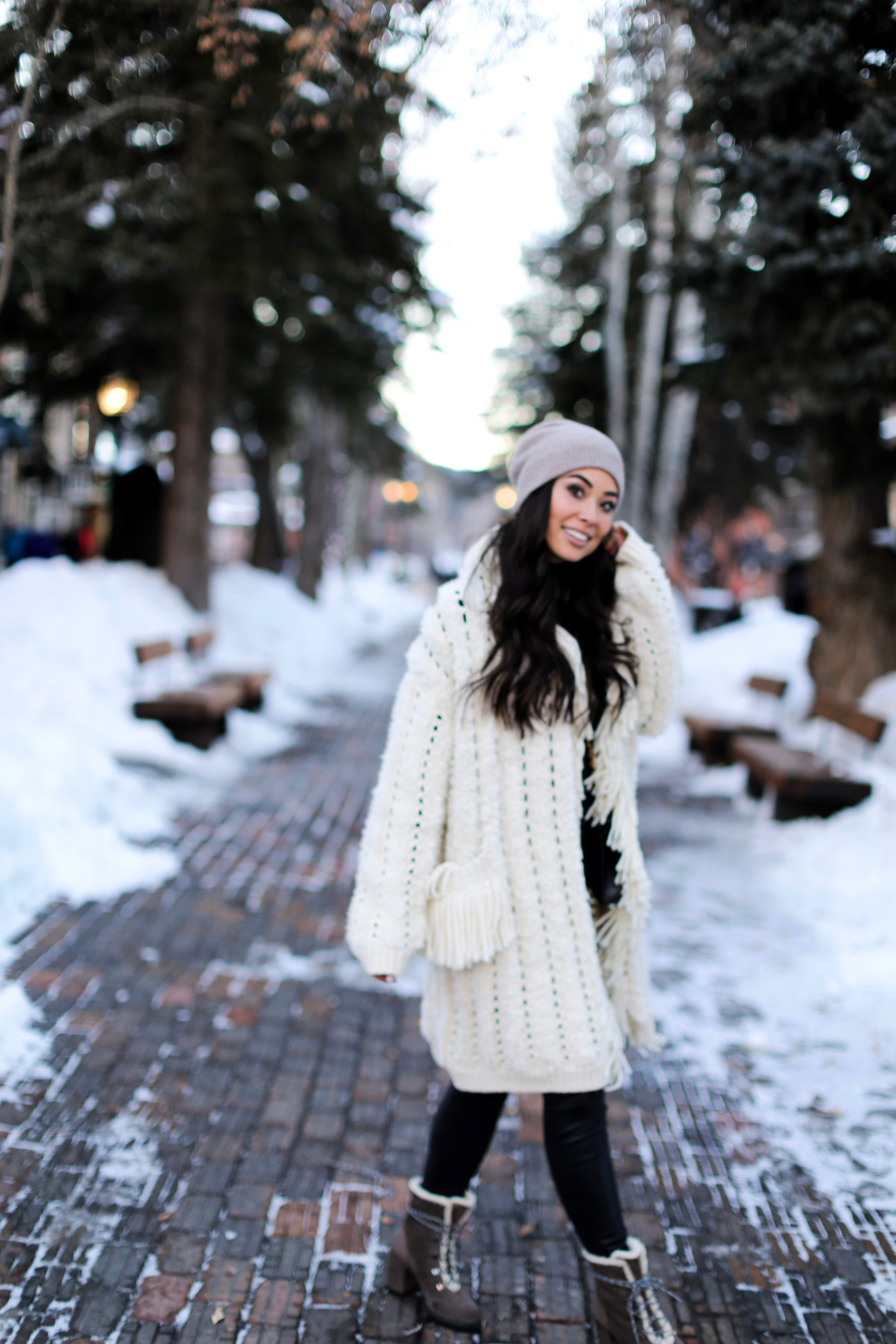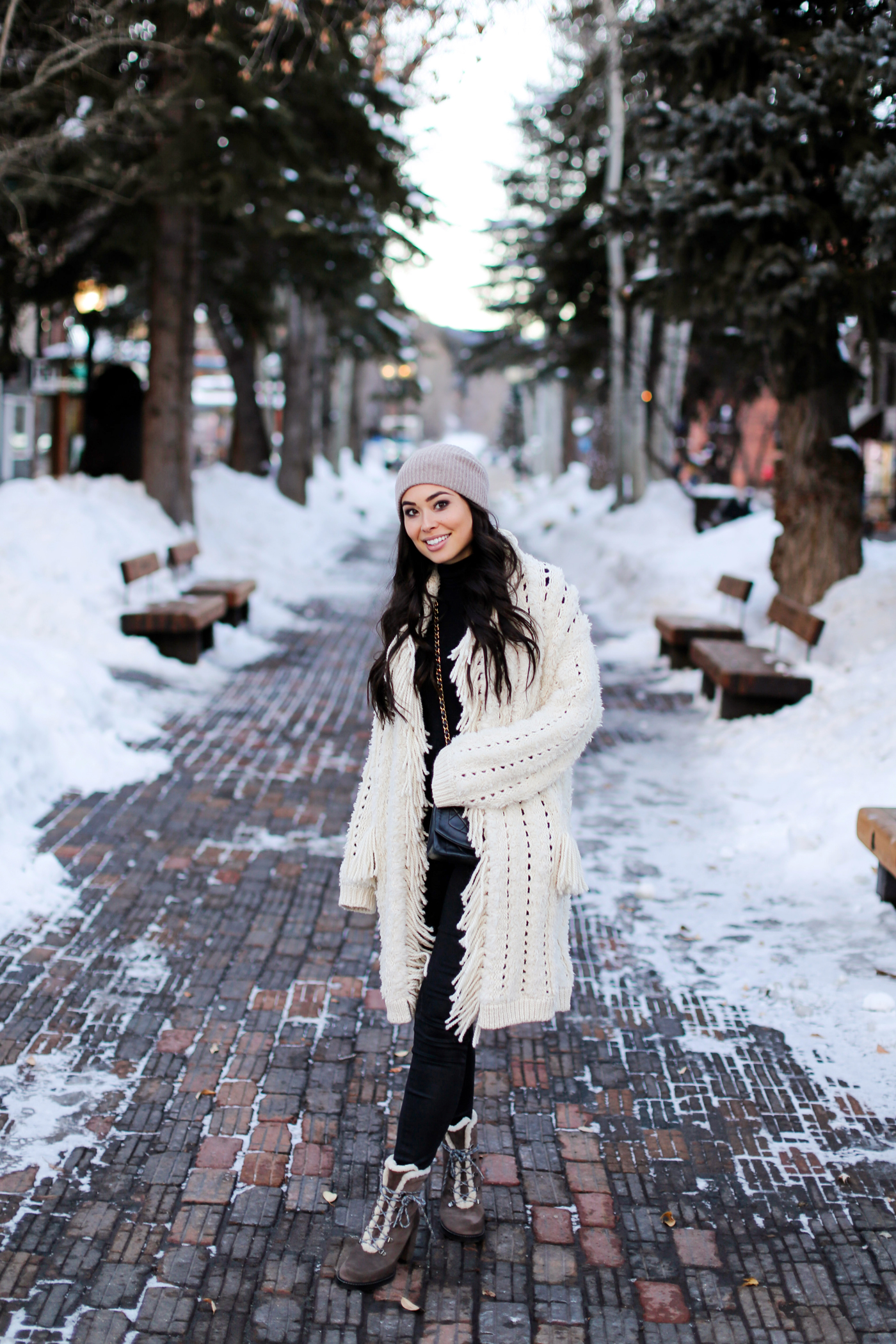 That fringe cardigan has all the cozy vibes! So cute for Winter and perfect for Aspen!