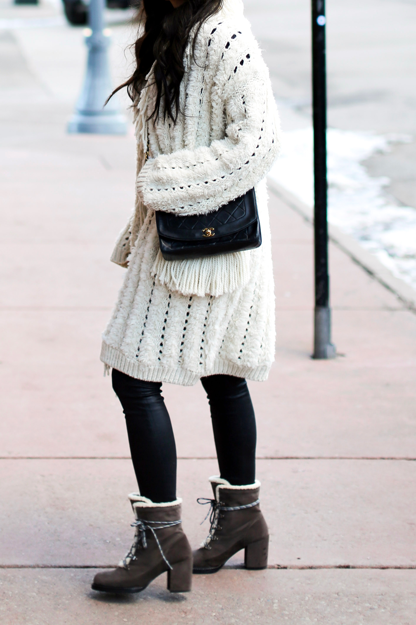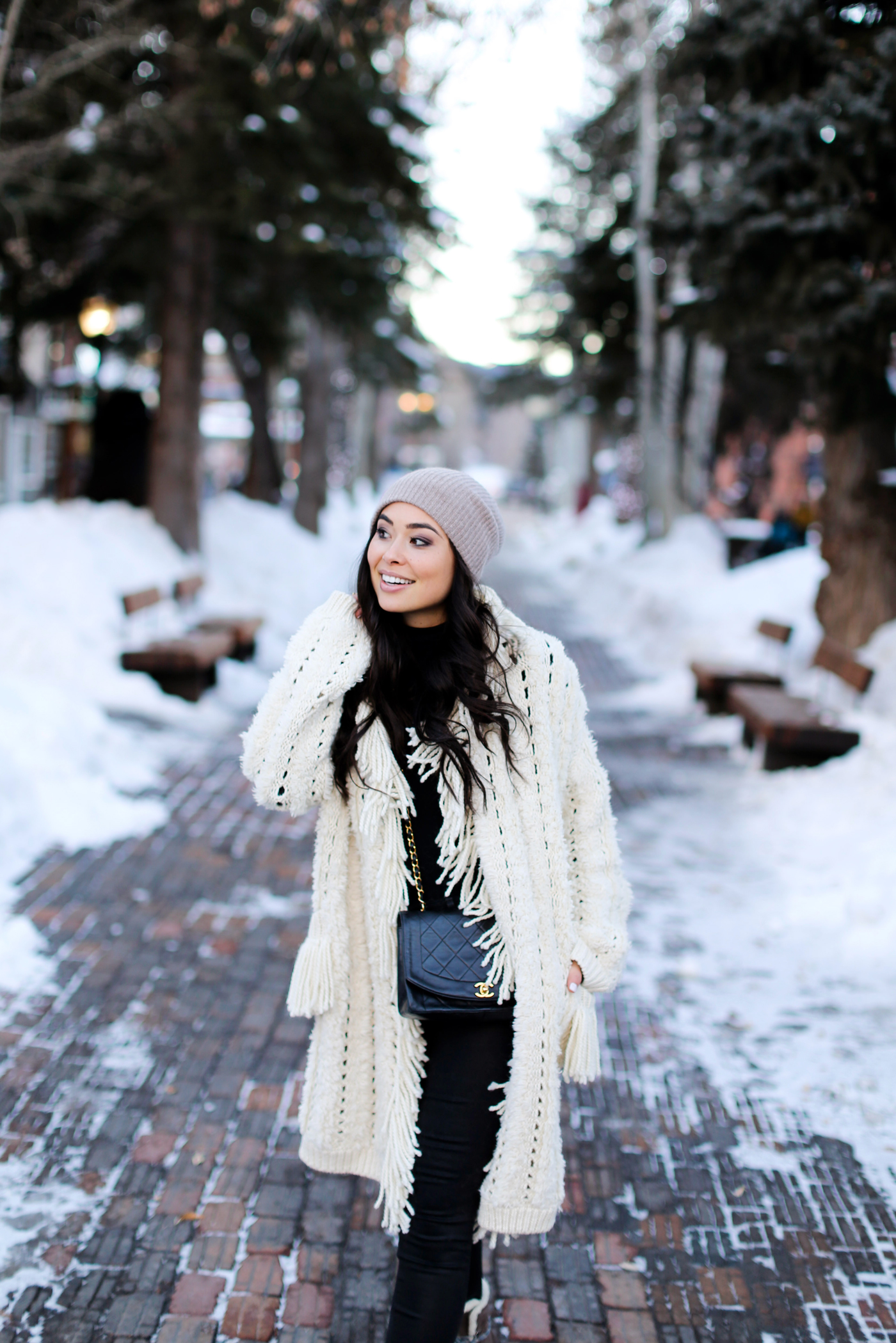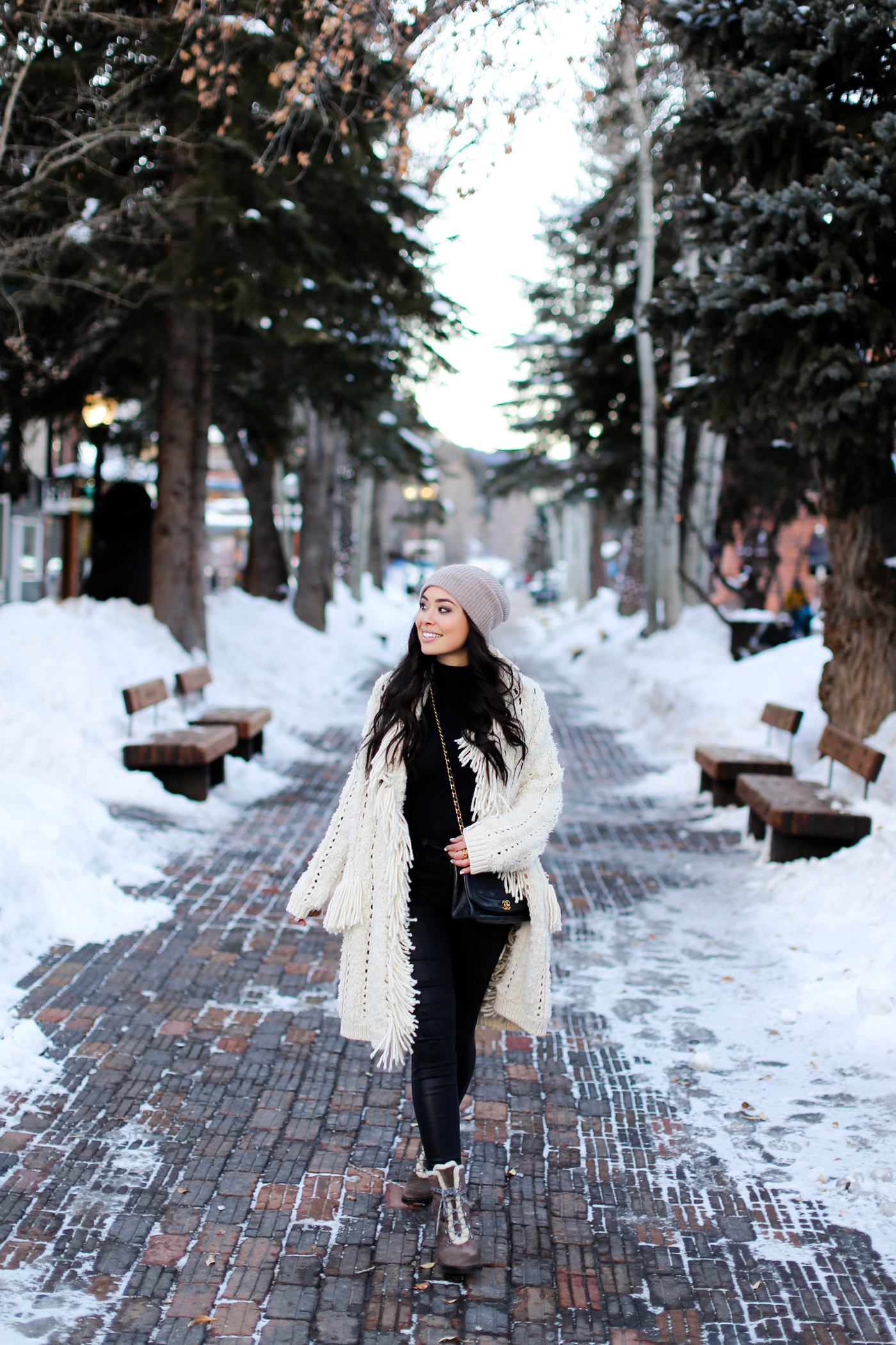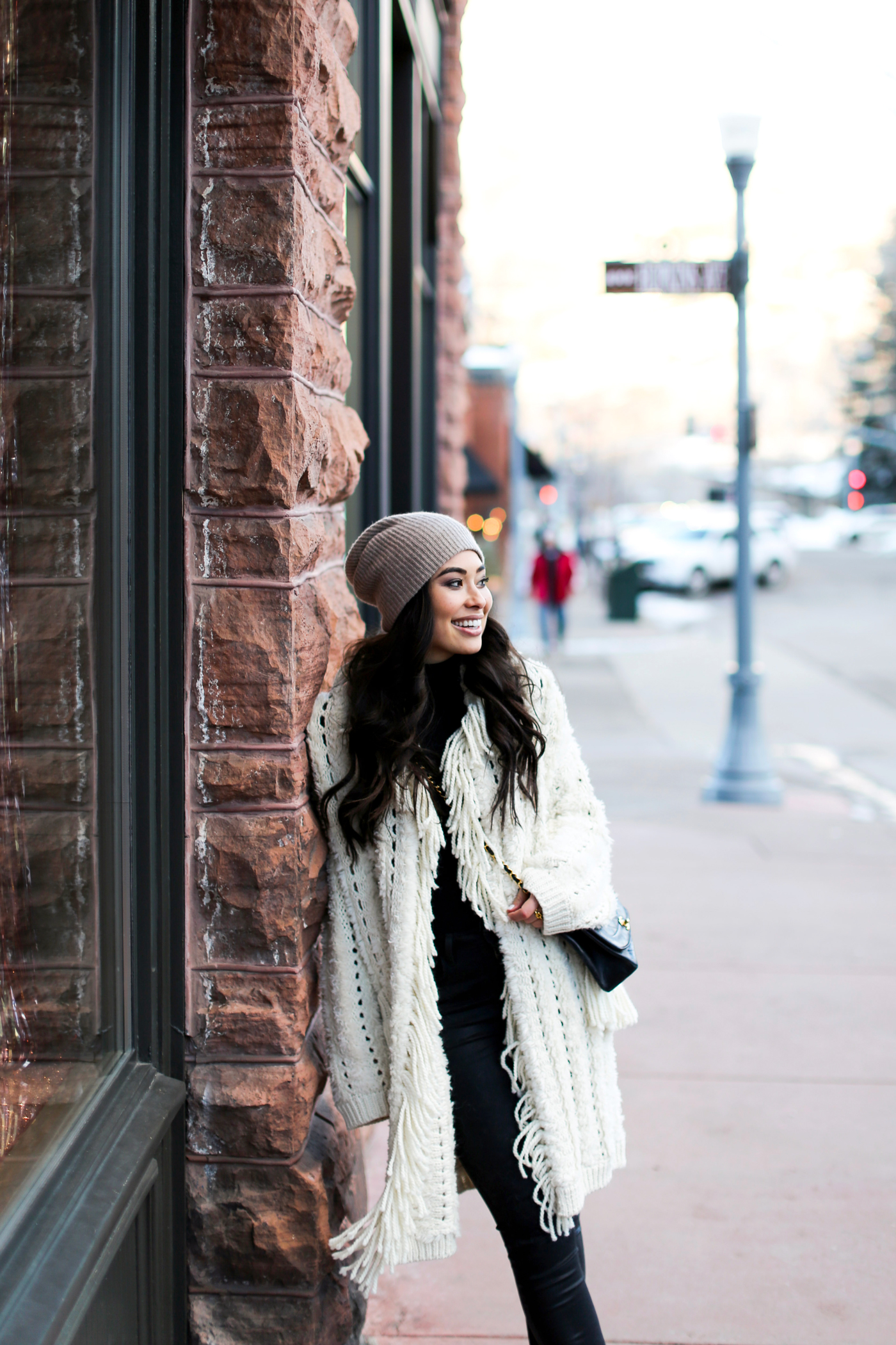 That fringe cardigan has all the cozy vibes! So cute for Winter and perfect for Aspen!