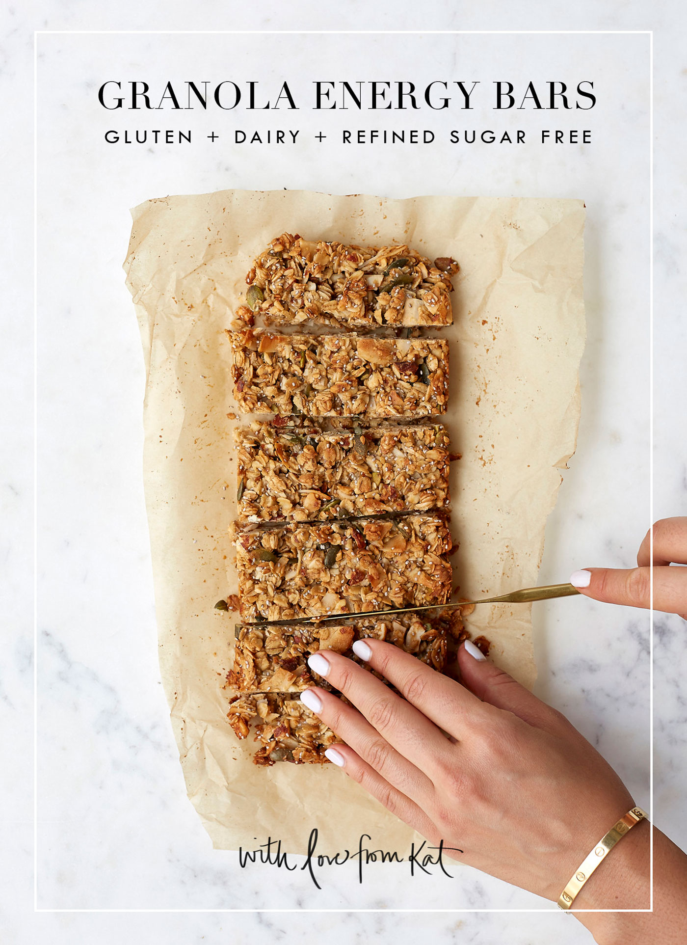 These delicious granola bars are completely free of gluten, dairy and refined sugar. Every single recipe in my cookbook is actually free of gluten, dairy and refined sugar! I like to eat this way 80% of the time because it allows me to look and feel my best and strengthens my digestion and immune system. Honestly, I hate being overly strict with what I eat so this lifestyle works really well for me! I’m all about that balance… and never like to deprive myself – life is too short. If you’re interested in what I eat in a day – you can read my post here, and if you’re interested in what diets I’ve tried/my overall thoughts on them – you can read my post about that here! Plus I’m also always posting new recipes and behind the scenes stories of what I’m eating throughout the day on Instagram (@kattanita.)