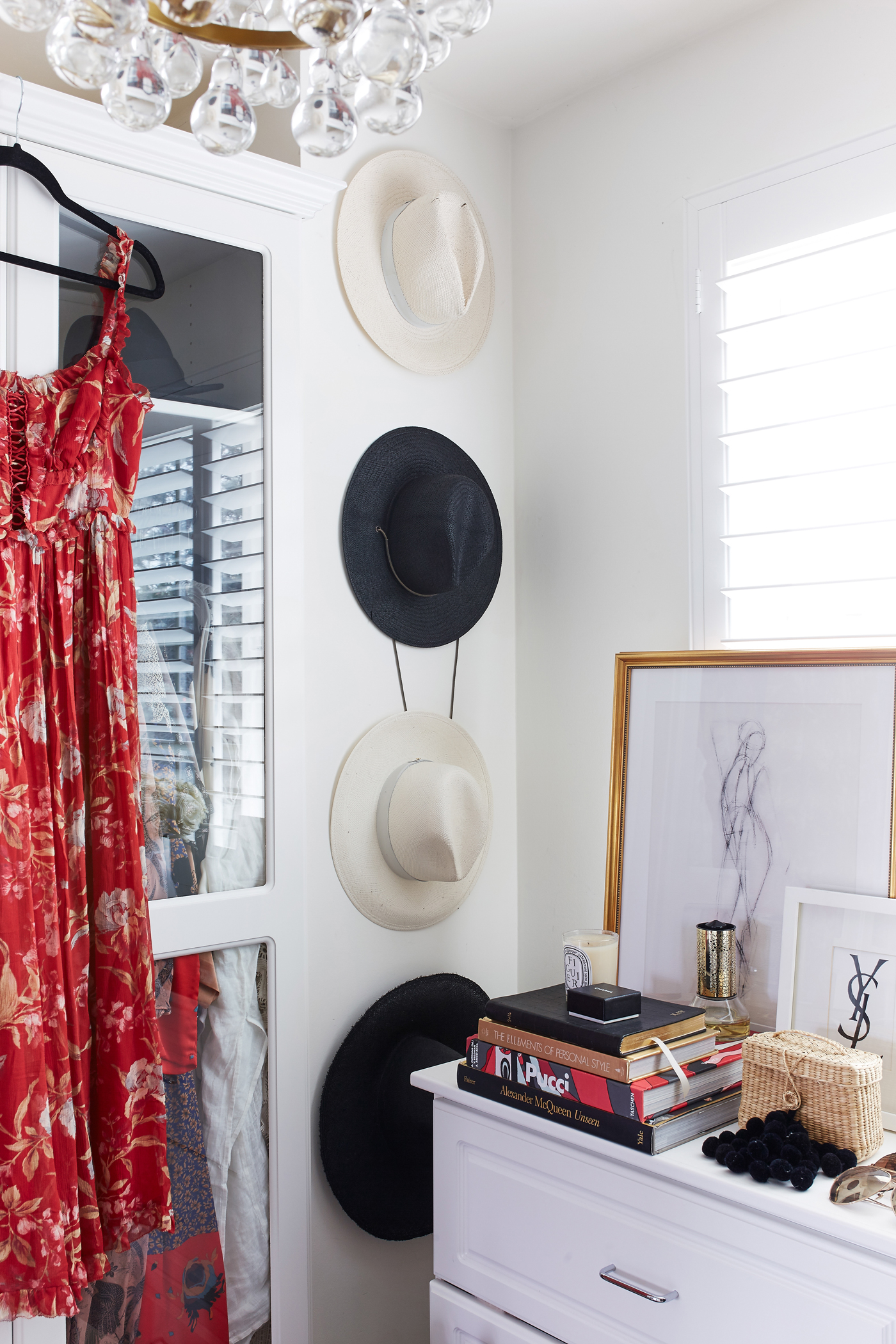 I love the Ikea Billy bookcase for storing bags + shoes, these black velvet hangers for clothes, these lucite bins for accessories, old shoe boxes for office supplies, and wicker baskets/bags for miscellaneous items and as decor. I use these Serena & Lily baskets as my hampers and they’re currently 20% off!
