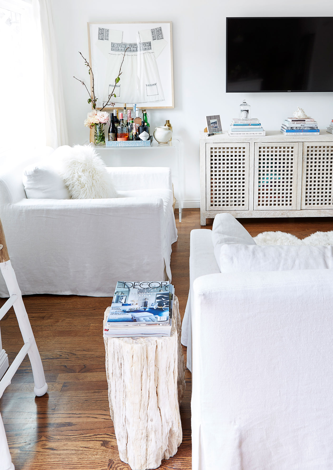 Restoration Hardware couch + chair  |  Wisteria side table  |  CB2 lucite bar