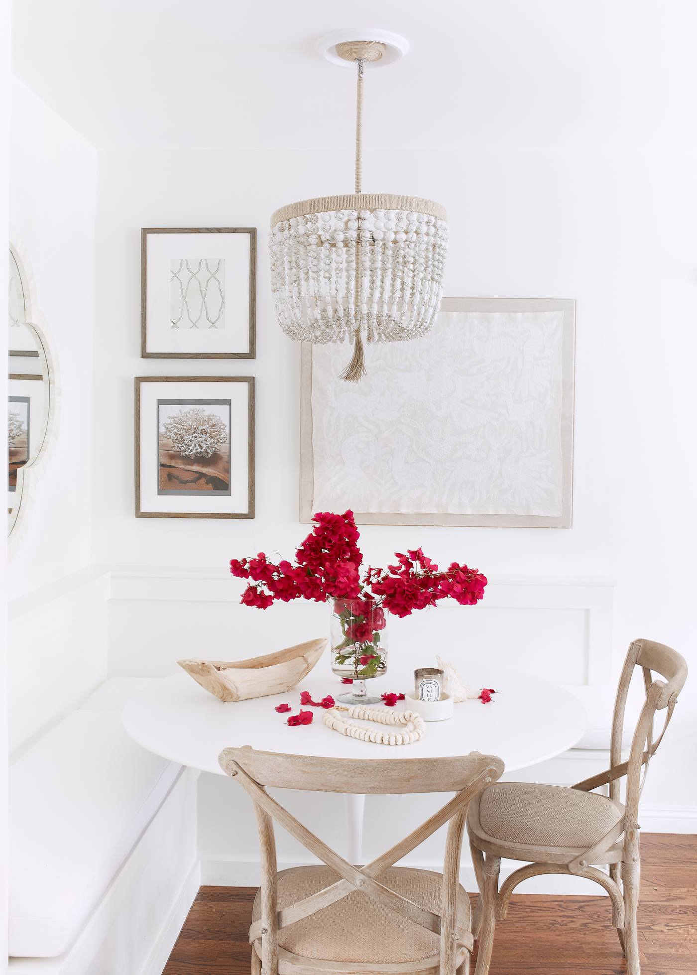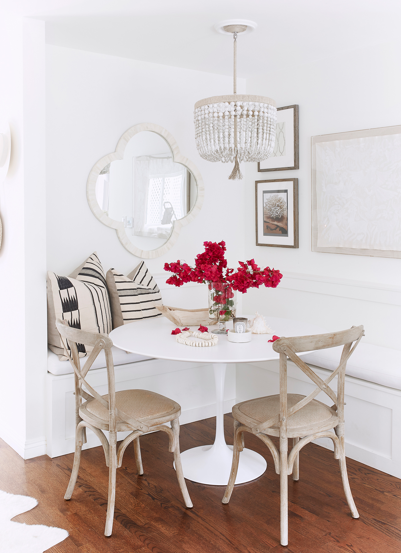 I hope you had a great weekend! I am so excited to share my dining nook with you. This little alcove was empty when I moved in, and I immediately envisioned a cozy dining bench built into the corner. I found a picture of one I loved on Pinterest, showed it to my contractor and he built it in 2 days. It’s one of my most used areas in the house. I love eating breakfast here, having meetings around the table, and bringing my laptop to work. I rotate the flowers and coffee table books I keep on it and it always brightens my day when I walk by and see a pop of color in that corner.