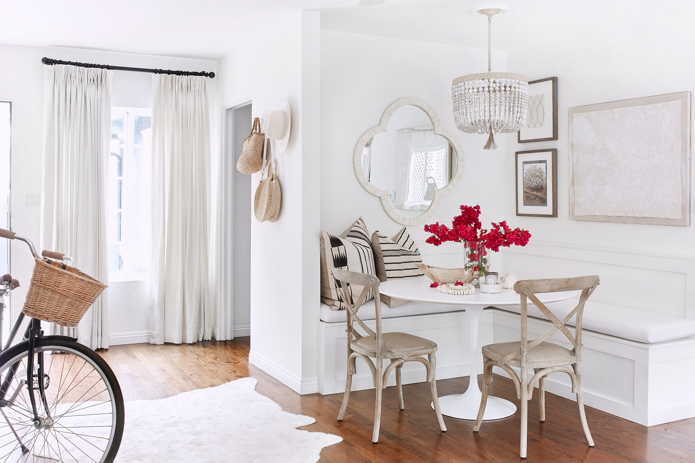 I hope you had a great weekend! I am so excited to share my dining nook with you. This little alcove was empty when I moved in, and I immediately envisioned a cozy dining bench built into the corner. I found a picture of one I loved on Pinterest, showed it to my contractor and he built it in 2 days. It’s one of my most used areas in the house. I love eating breakfast here, having meetings around the table, and bringing my laptop to work. I rotate the flowers and coffee table books I keep on it and it always brightens my day when I walk by and see a pop of color in that corner.