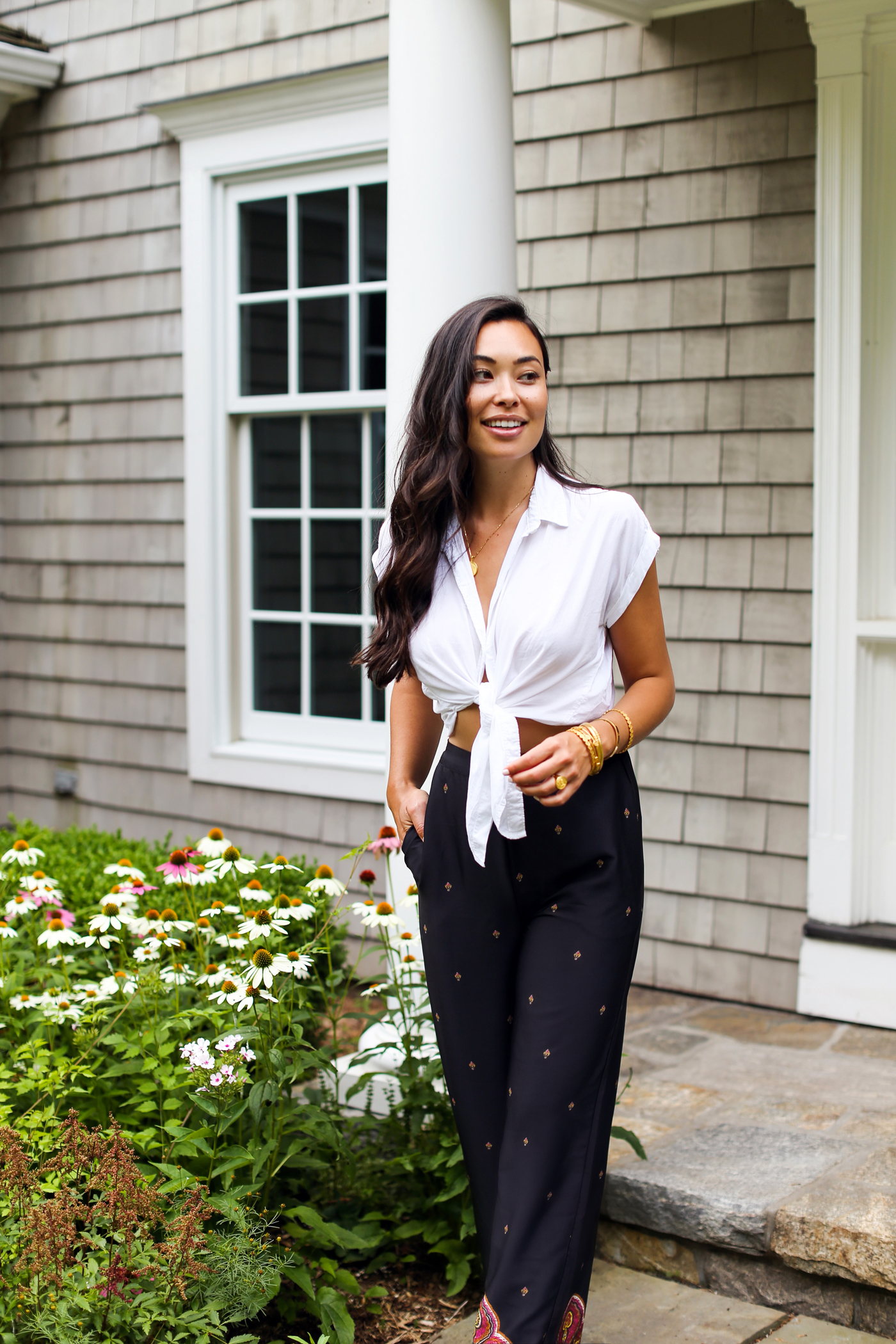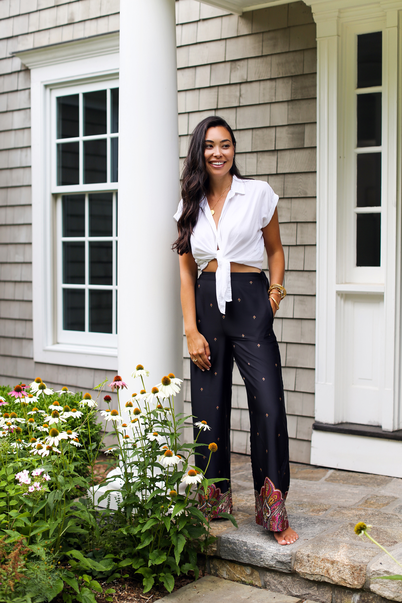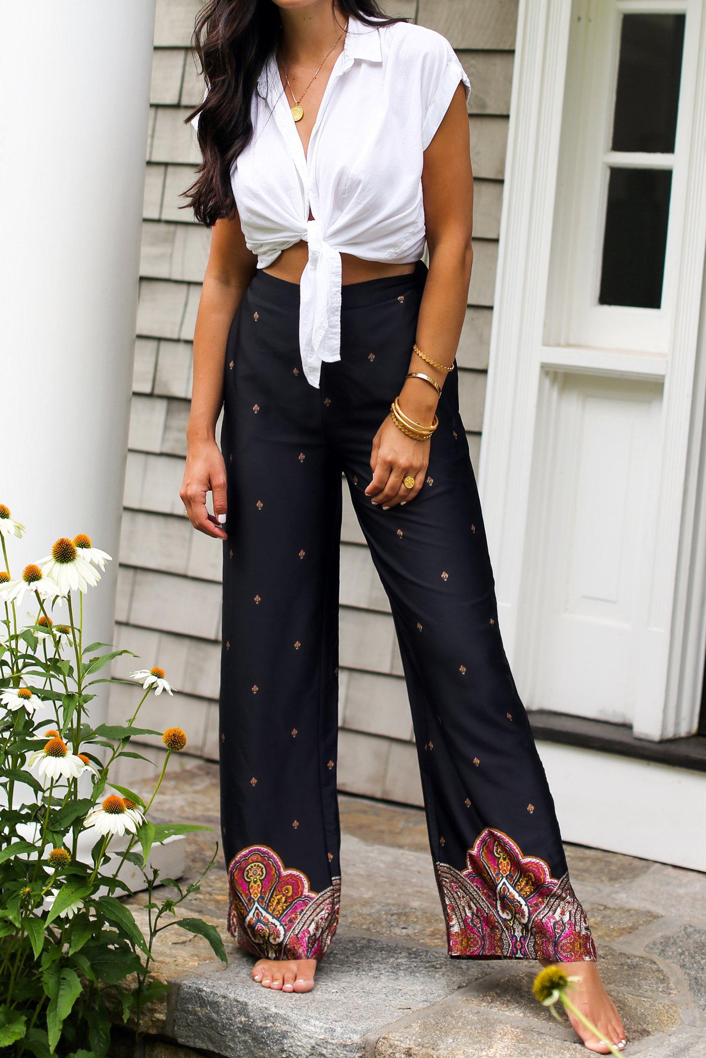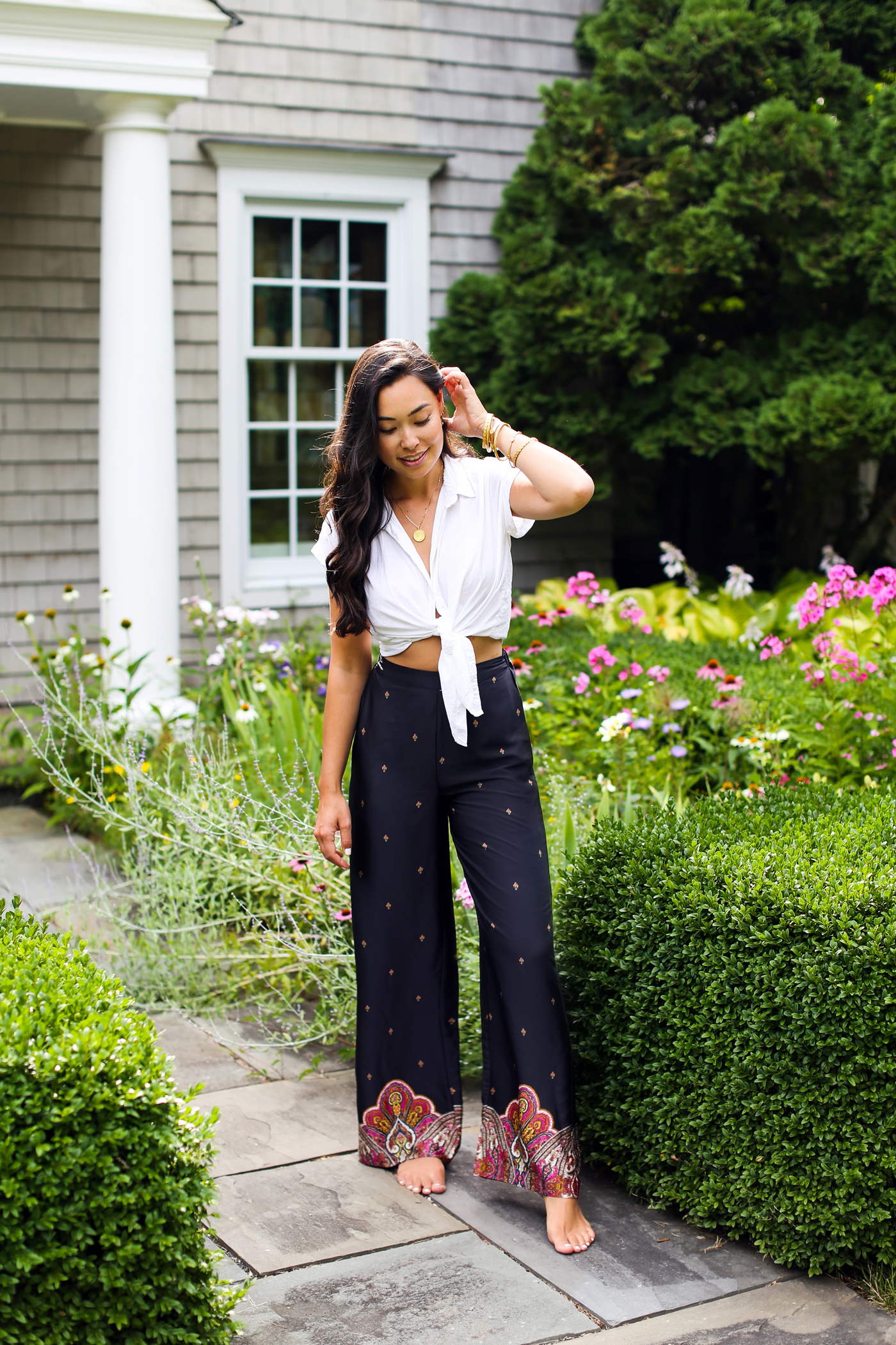 I’ve been gravitating towards light, chic pants like this for summer days and nights. These pants are even more GORGEOUS in person and feel like silk. They’re the perfect shade of navy blue, and have such a pretty paisley print on the bottom. They run true to size (wearing a small here.) The waistband is elastic making them easy to throw on and move around in. I didn’t have to hem the bottom (I’m a little over 5’6”) and usually pair them with a gold or tan strappy sandal. They would also look great with a heel or wedge especially if you’re under 5’6”!