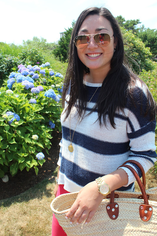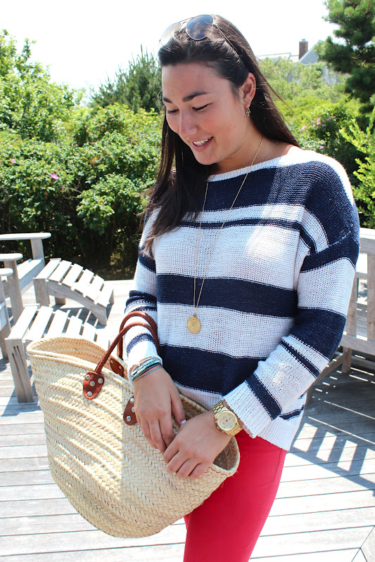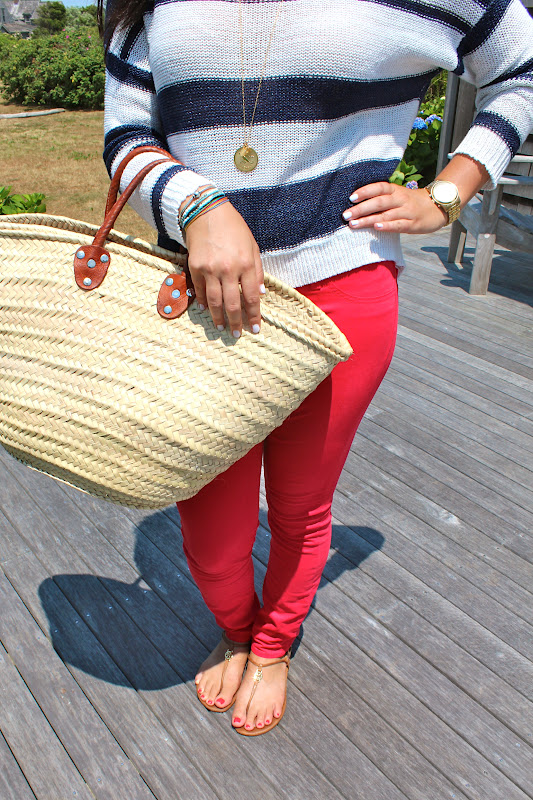 Joie sweater (different color here), JBrand jeans, Anthropologie french market basket, a.v. max zodiac necklace, Michael Kors watch, Ray Ban sunglasses, Lee Brevard earrings, Katy Conley bracelets, Tory Burch sandals
