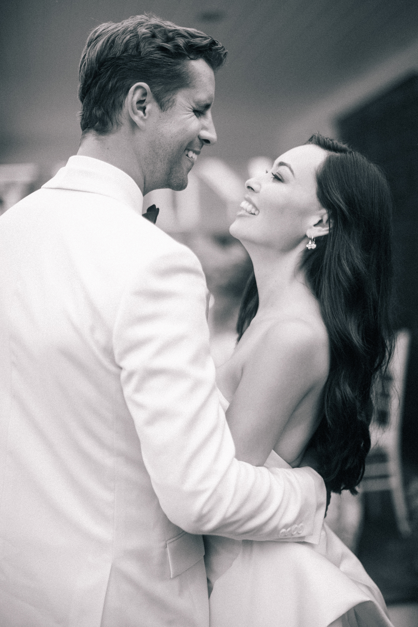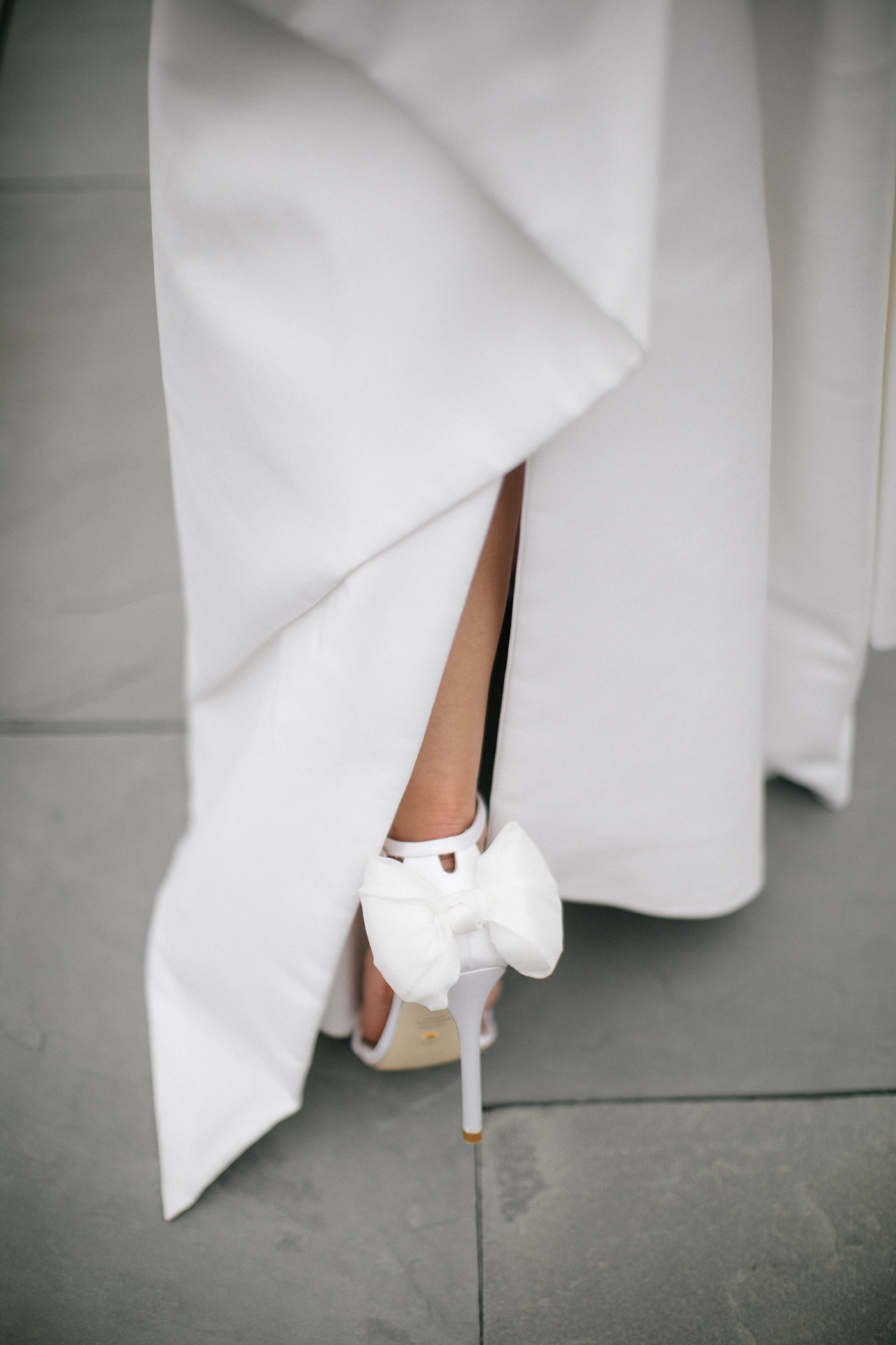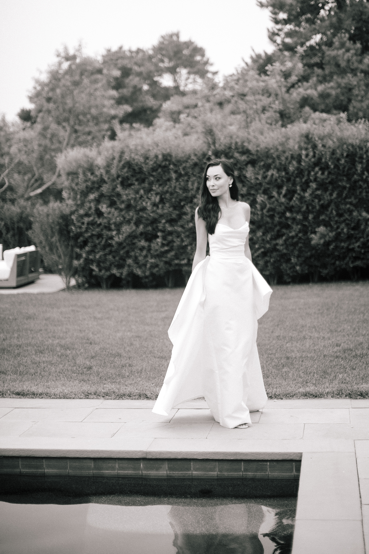 I picked out this Monique Lhuillier wedding dress for our rehearsal. I fell in love with the origami back detail which cascaded and draped in the most unique places. The original design had a longer train, but we shortened it to just brush the floor with heels. Originally, I actually wanted a simple and sleek wedding dress style like this, but when I tried it on, I knew it would be even better suited for the rehearsal night! Monique’s pieces are such a dream. This exact style is called the Raine and was purchased at her Madison Avenue boutique, but I’ve linked several similar options below! For my shoes, I wore these fun Stuart Weitzman heels and for accessories – I wore my everyday, favorite charm earrings from Lee Brevard.
