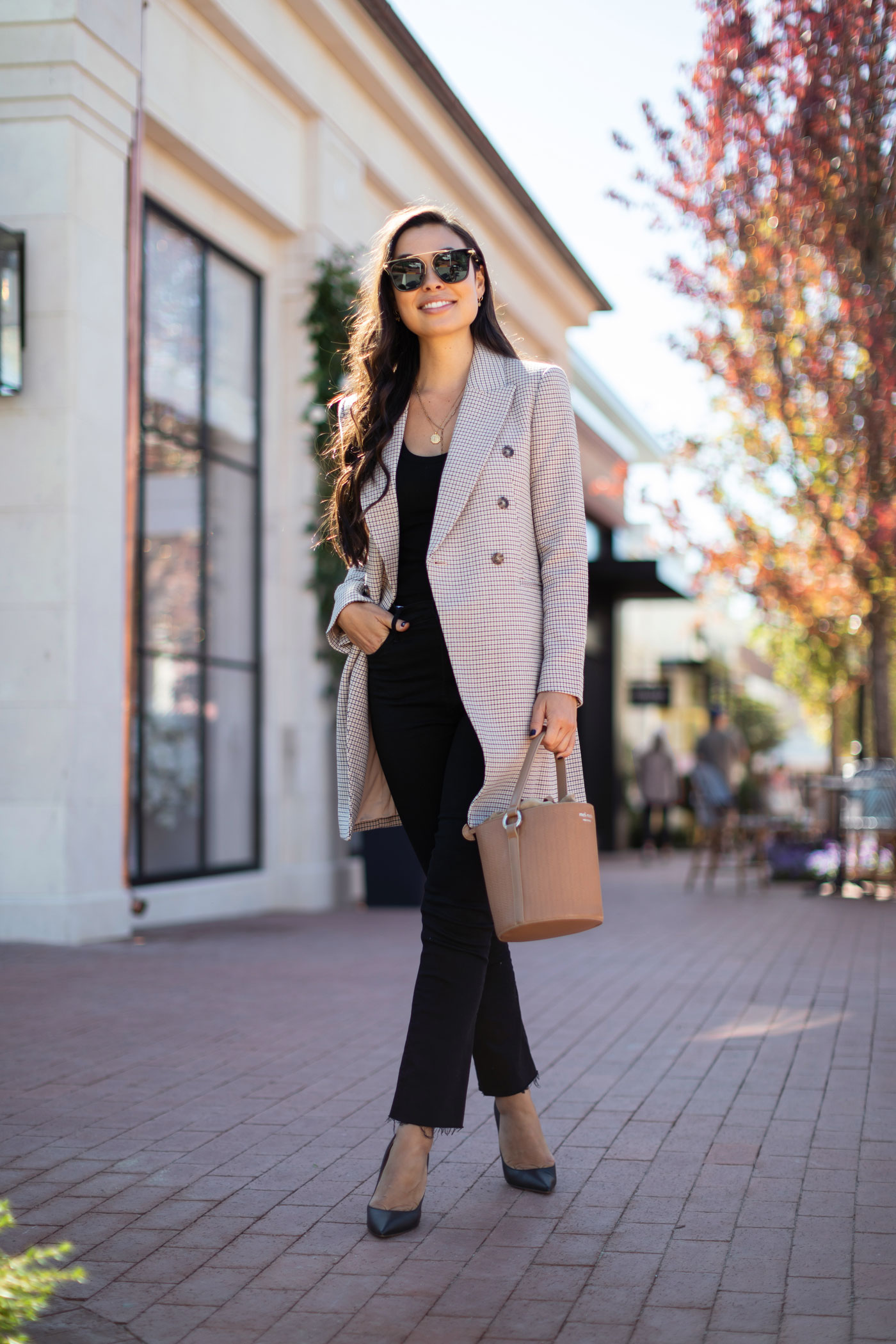It’s actually a coat that I could wear in LA on a chillier day and not feel ridiculous. It’s more like a long blazer – and just a tiny bit thicker than a normal blazer – so it makes that perfect in between “car coat” shall we say that will be versatile and classic for years to come. If you’re in between sizes, I recommend sizing down in this coat unless you’re planning on layering a super chunky sweater or turtleneck underneath. I got a size small, but it’s definitely a little roomy…and I could have done an XS especially since I’ll probably only be wearing a tank or t-shirt underneath it here.