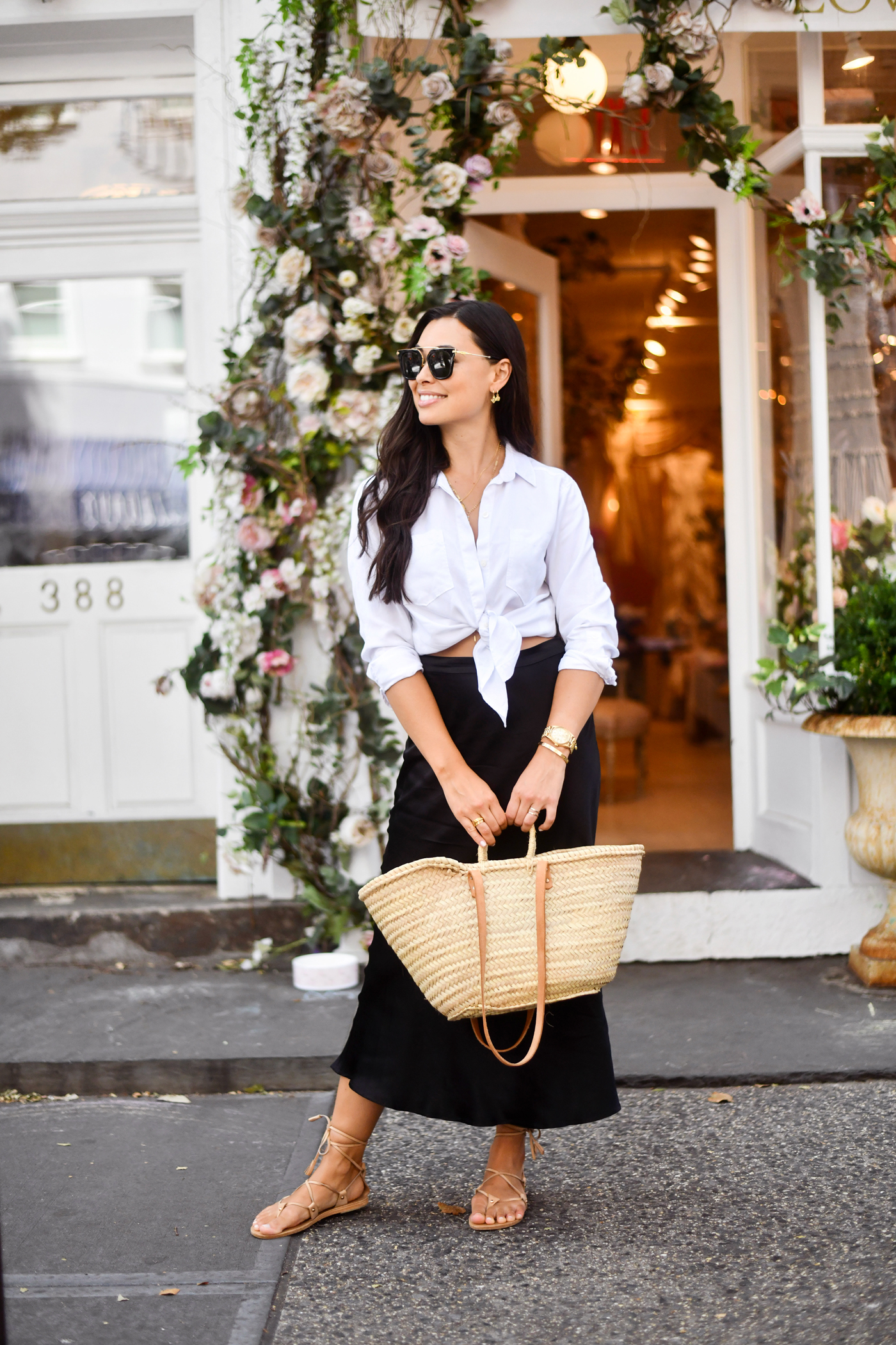 I have been soaking up every second of this gorgeous summer weather! It’s been in the 80s all week in NYC and I’ve been out and about, wearing all of my light summer pieces. I picked up this black silk skirt in Montauk the other weekend at the Bluestone Lane Collective boutique – and I love the way it drapes. It’s from a small Aussie designer and also comes in white. This skirt is super similar and only $68.