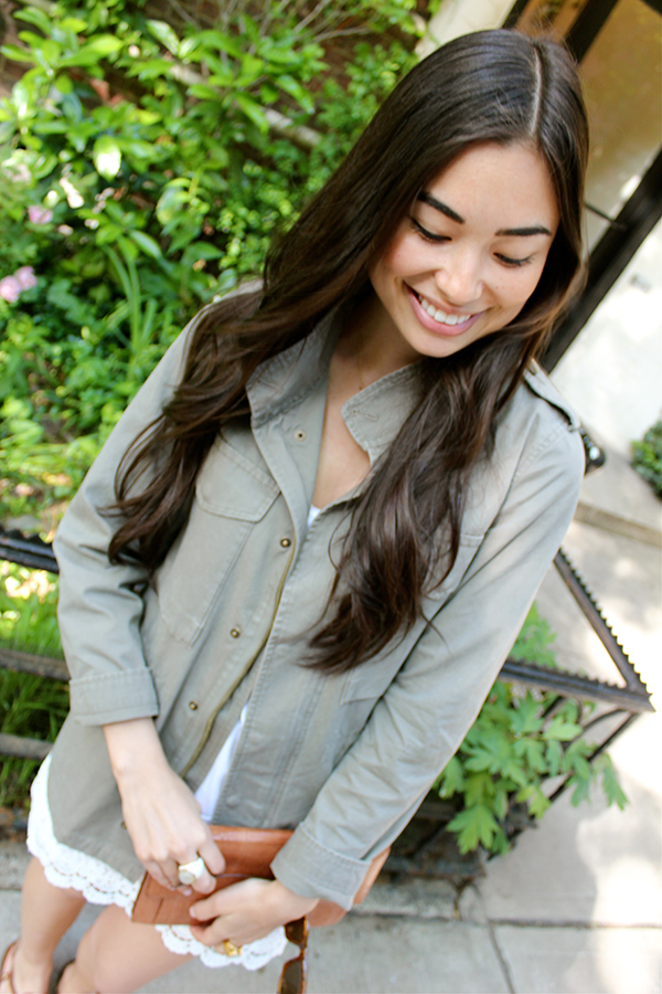 You are adorable and have paired the military-esque jacket with the ultra fem lace skirt perfectly. I've been looking for a jacket like that for a while and may cave and get a barbour one soon!