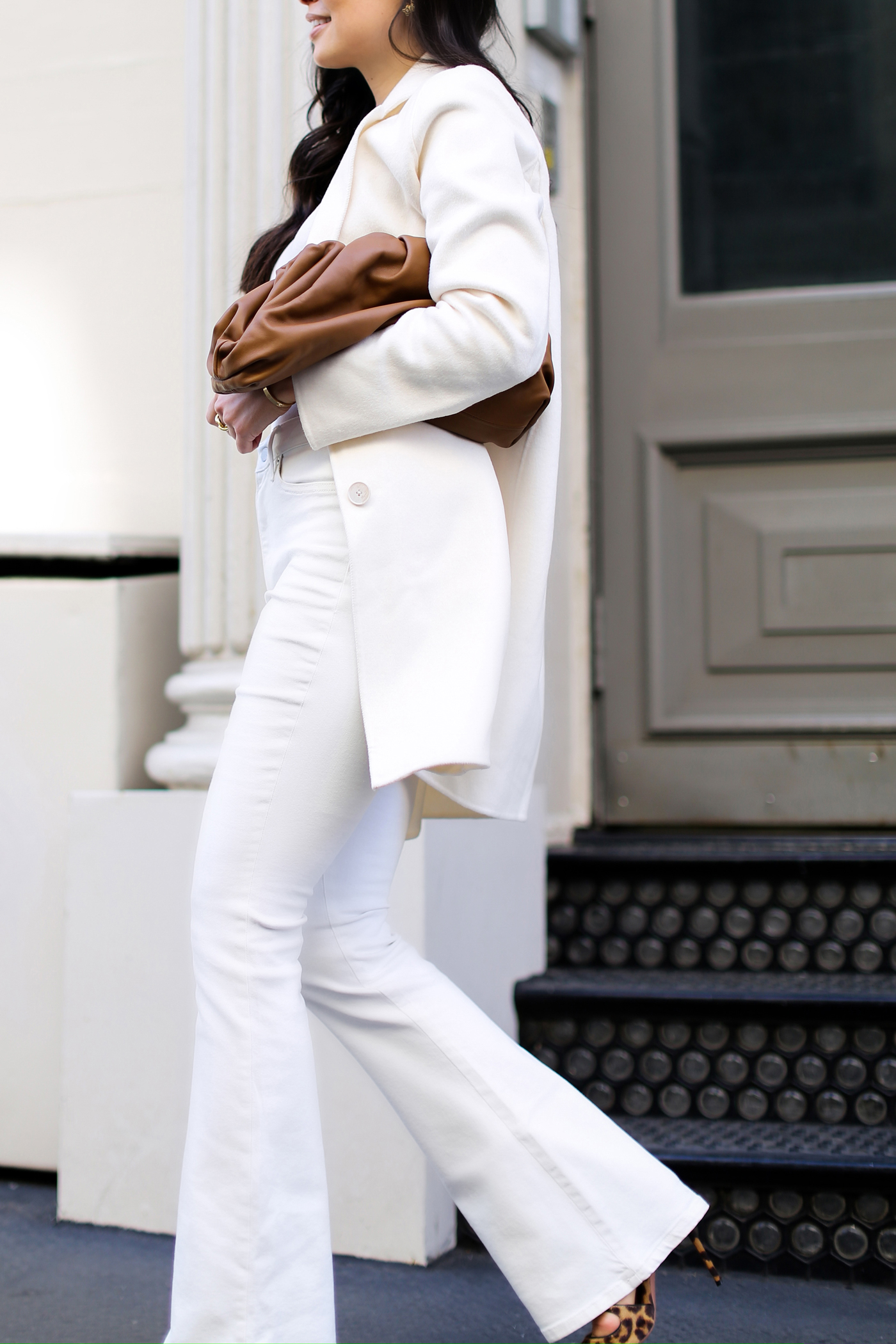 Every woman needs a few pairs of white jeans in her closet. They’re such a versatile pant and can be styled countless ways. I personally own 4 pairs; 1 pair of white skinny jeans, 1 pair of white distressed jeans, 1 pair of white corduroy pants, and 1 pair of white wide leg jeans (as seen here.) I LOVE a wide leg pant, and cannot even begin to tell you how obsessed I am with these.
