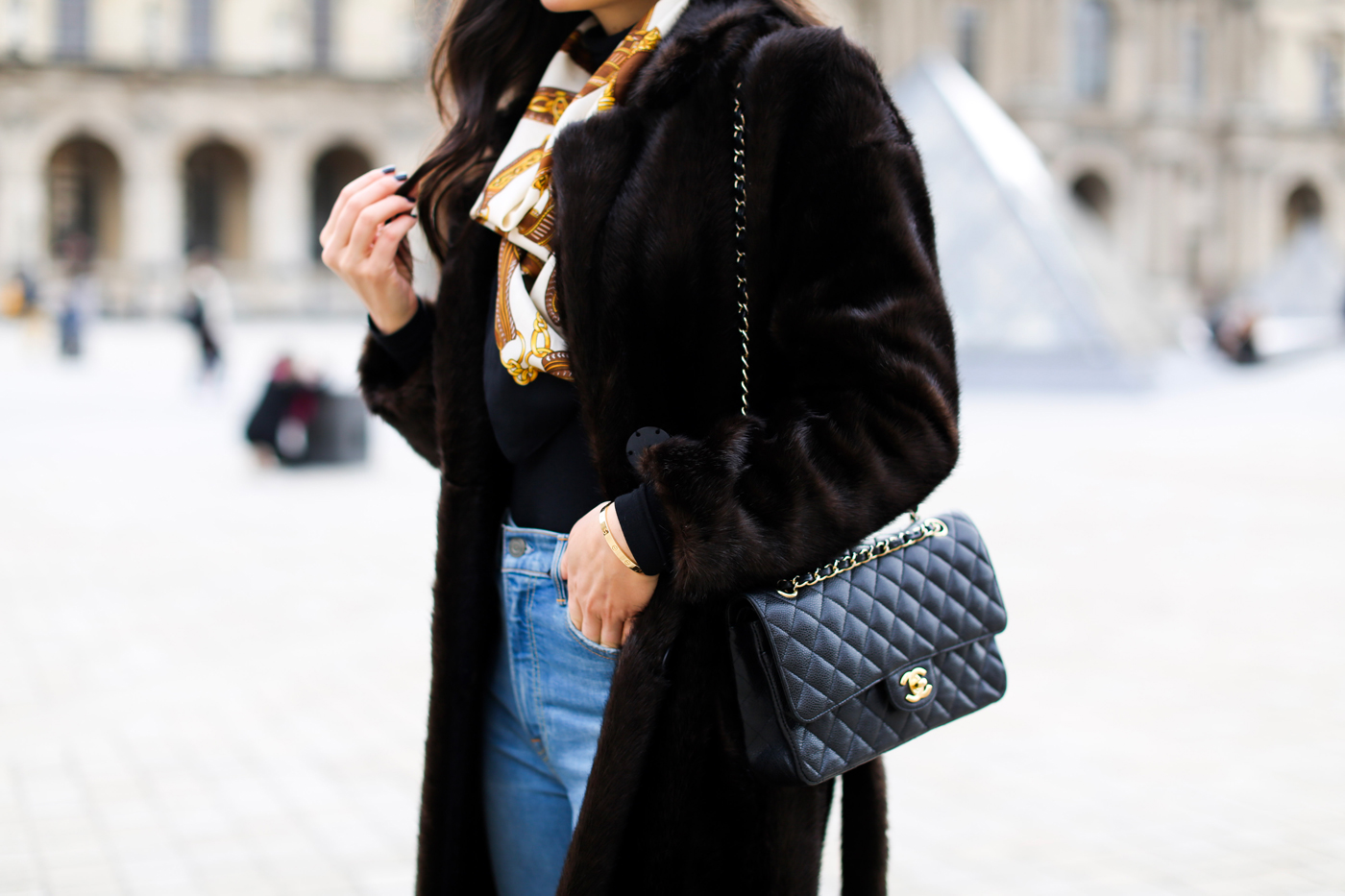I wore this gorgeous faux fur coat with my favorite Wolford turtleneck bodysuit for the day. I paired it with a vintage scarf (also love this one and this one) that I picked up at a consignment store years ago and couldn’t decide whether or not I liked it on for the pictures LOL. Which look do you prefer – with or without?!